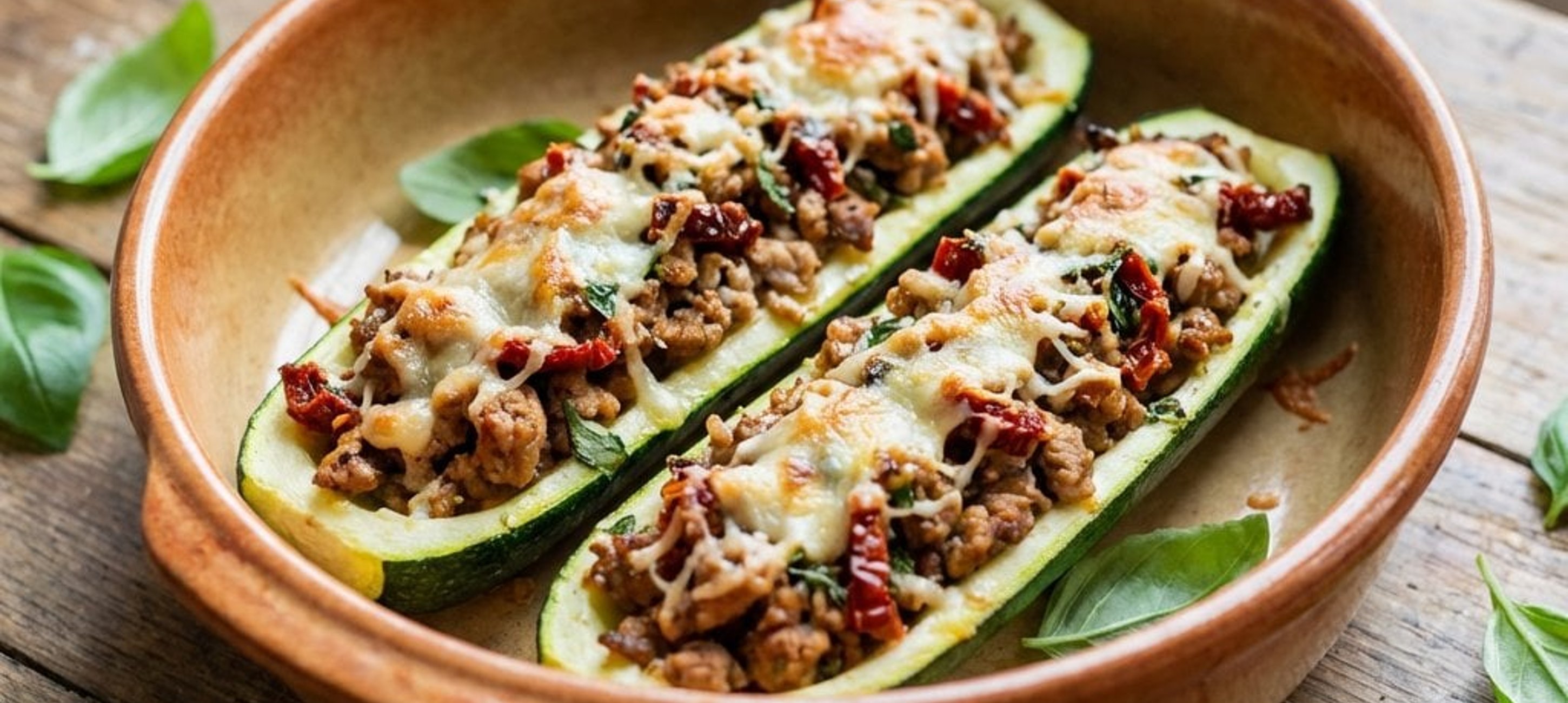 - 5Das Blech in den vorgeheizten Ofen schieben und die Zucchini 40–45 Minuten bei 185–190 °C backen. Nach dem Backen kurz ruhen lassen, portionieren und servieren.