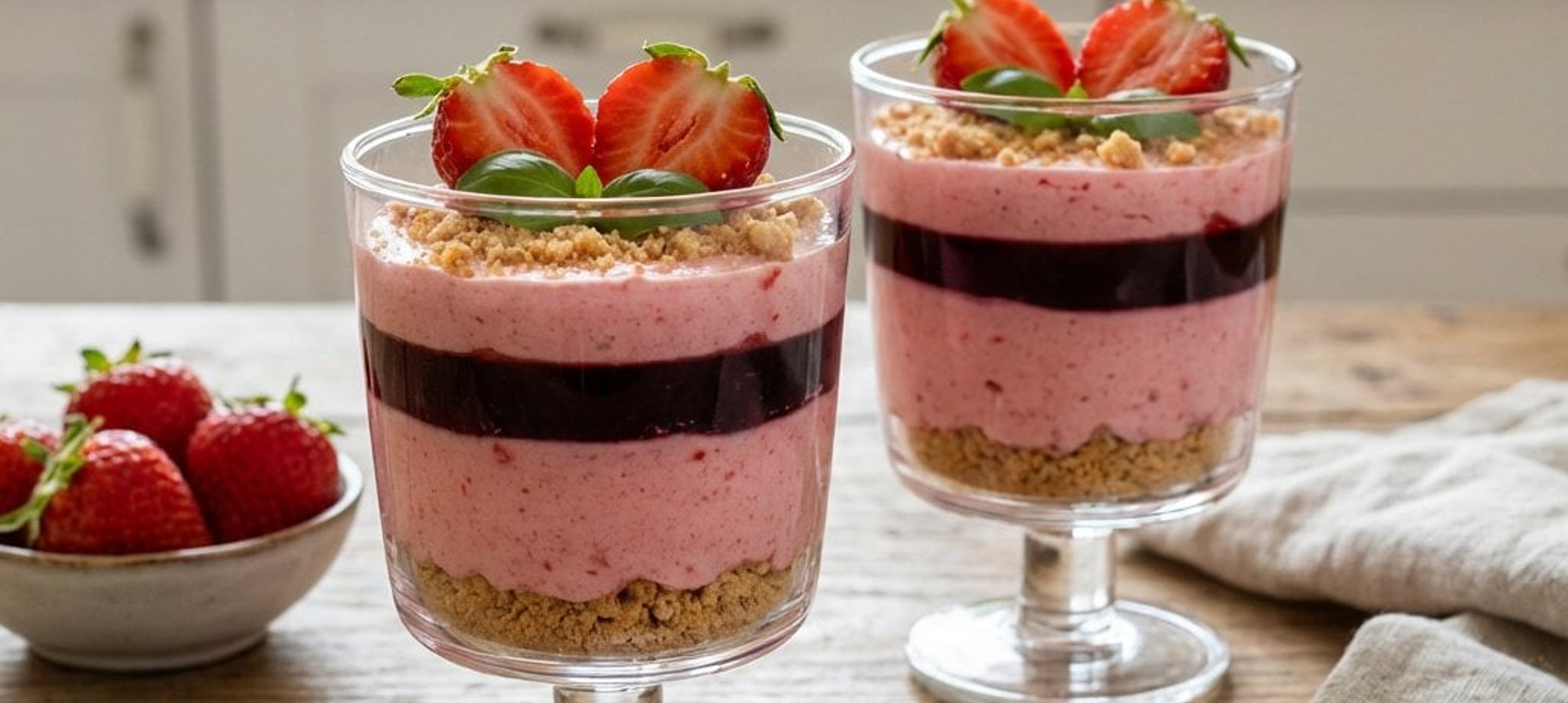 - 1Zerbröselte Kekse oder Granola auf den Boden der vorbereiteten Gläser verteilen. Die Gläser bis zur Hälfte mit der Erdbeer-Mousse füllen (ein Spritzbeutel hilft dabei, die Glaswände sauber zu halten). Einen Esslöffel Gelee hinzufügen und mit der restlichen Mousse auffüllen. Zum Schluss nochmals etwas Gelee obenauf geben.
