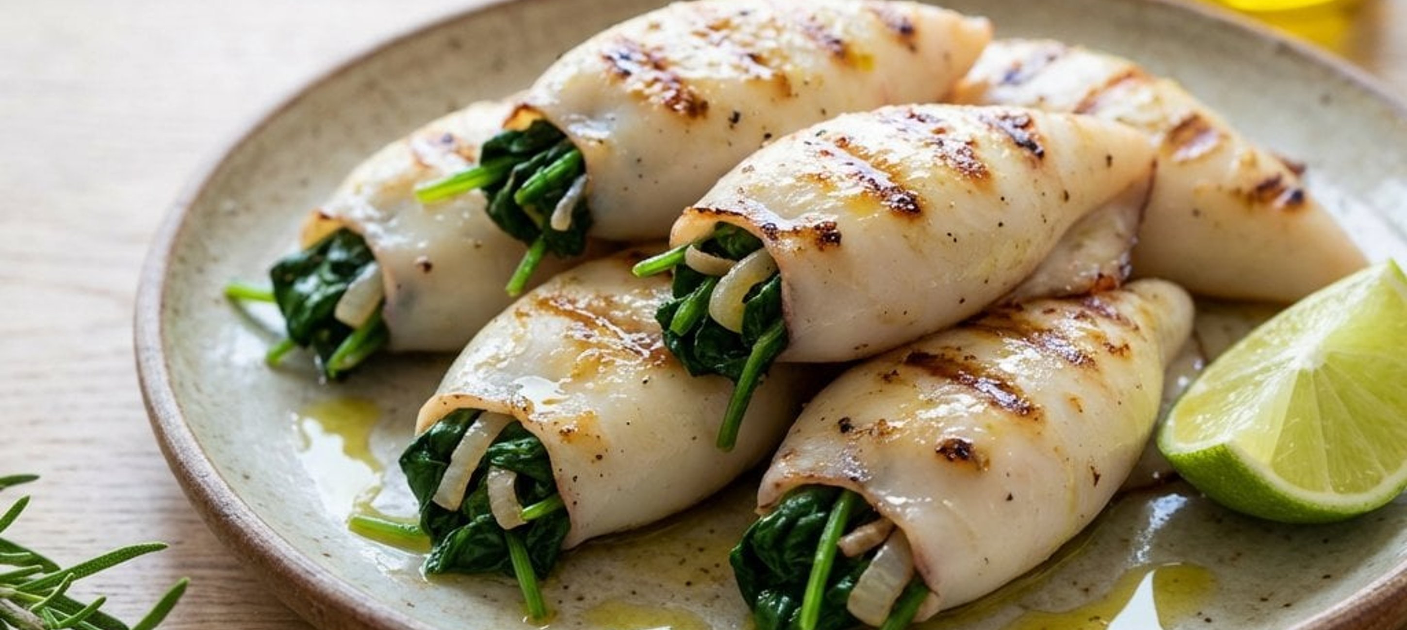 - 5Den Grill auf maximale Hitze vorheizen. Die gefüllten Calamari von jeder Seite ca. 3-4 Minuten scharf grillen. Alternativ können sie auch in einer heißen Pfanne zubereitet werden. Mit den restlichen Limettenspalten servieren.