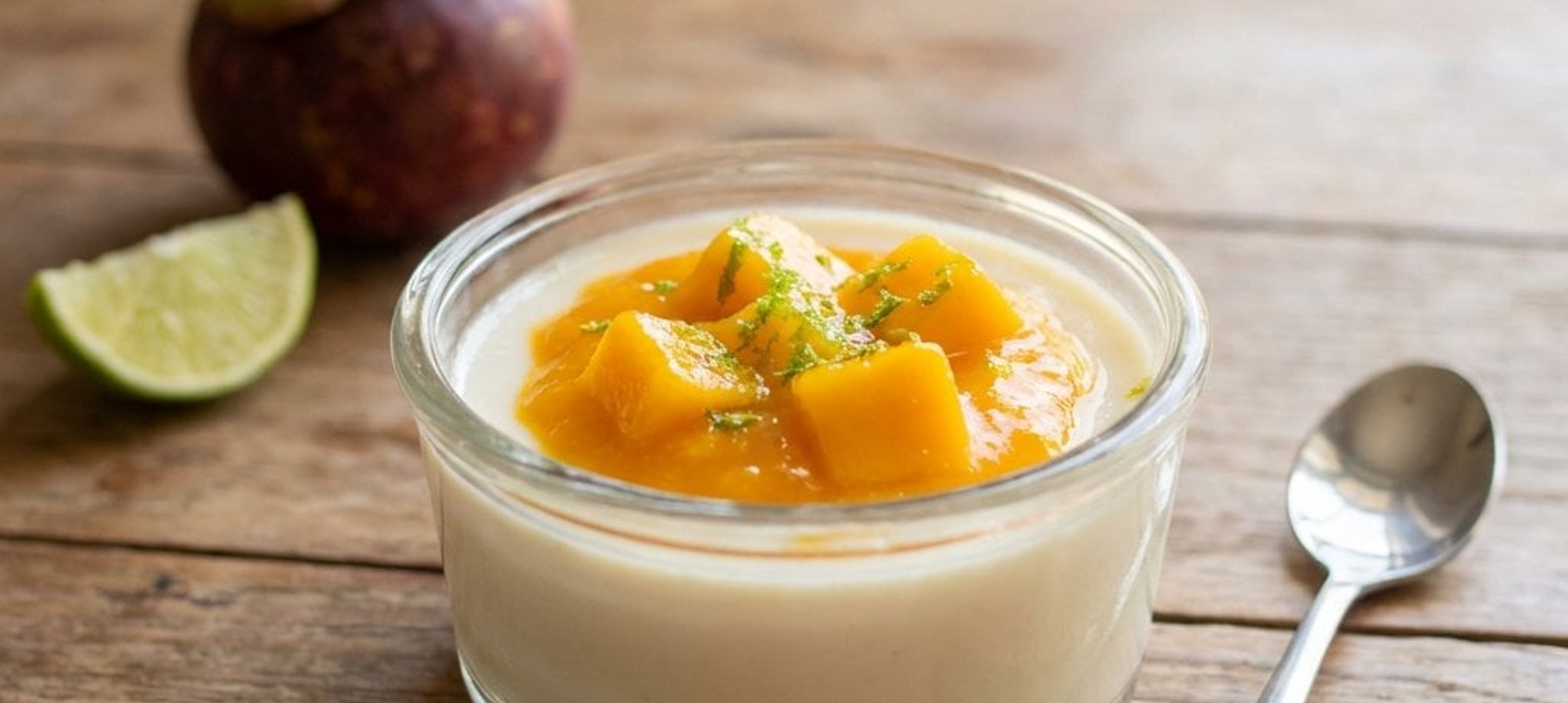 - 3Das abgekühlte Mango-Ragout gleichmäßig auf die fest gewordene Panna Cotta in den Gläsern verteilen und servieren.