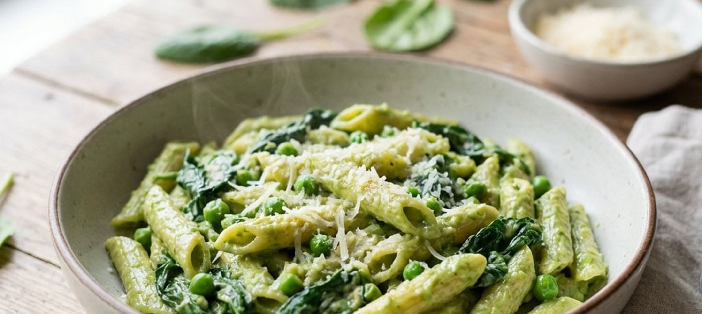 - 2In der Zwischenzeit die Sauce vorbereiten: Die Avocado halbieren, den Kern entfernen und das Fruchtfleisch mit einem Löffel herauslösen. Avocado, Erbsen, Babyspinat, Petersilie, Zitronensaft, fein geriebenen Parmesan, Chiliflocken und Milch in einen Mixer oder Food Processor geben. Alles zu einer glatten, cremigen Sauce pürieren. Mit Salz und Pfeffer abschmecken.
