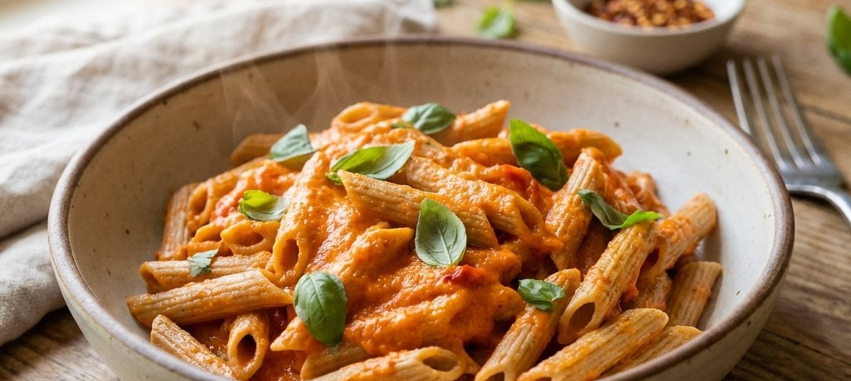 - 5Mischen Sie die gekochten Penne unter die glatte Sauce. Richten Sie die Pasta auf Tellern an und servieren Sie sie nach Belieben mit etwas frischem Basilikum und einem Spritzer Olivenöl.