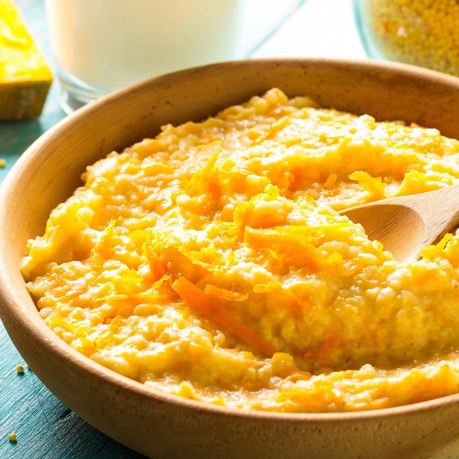 - 350g Hirseflocken einrühren. Den Brei aufkochen lassen und dabei ständig rühren.
