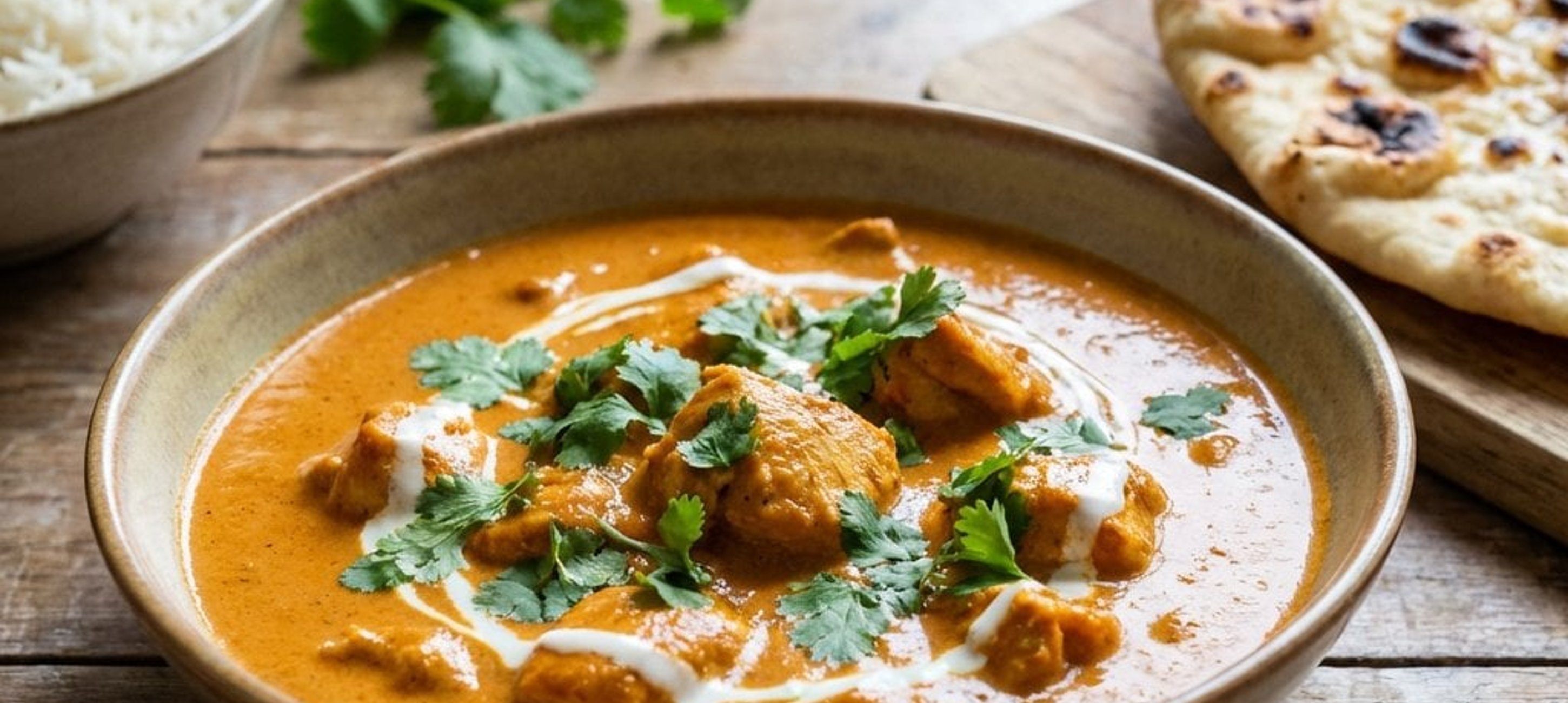 - 2Die Butter Chicken Sauce hinzufügen und alles bei mittlerer Hitze etwa 6-7 Minuten köcheln lassen, bis das Hähnchen vollständig gegart ist. Währenddessen den Basmatireis nach Packungsanweisung kochen und das Naan-Brot kurz im Ofen oder Toaster erwärmen.