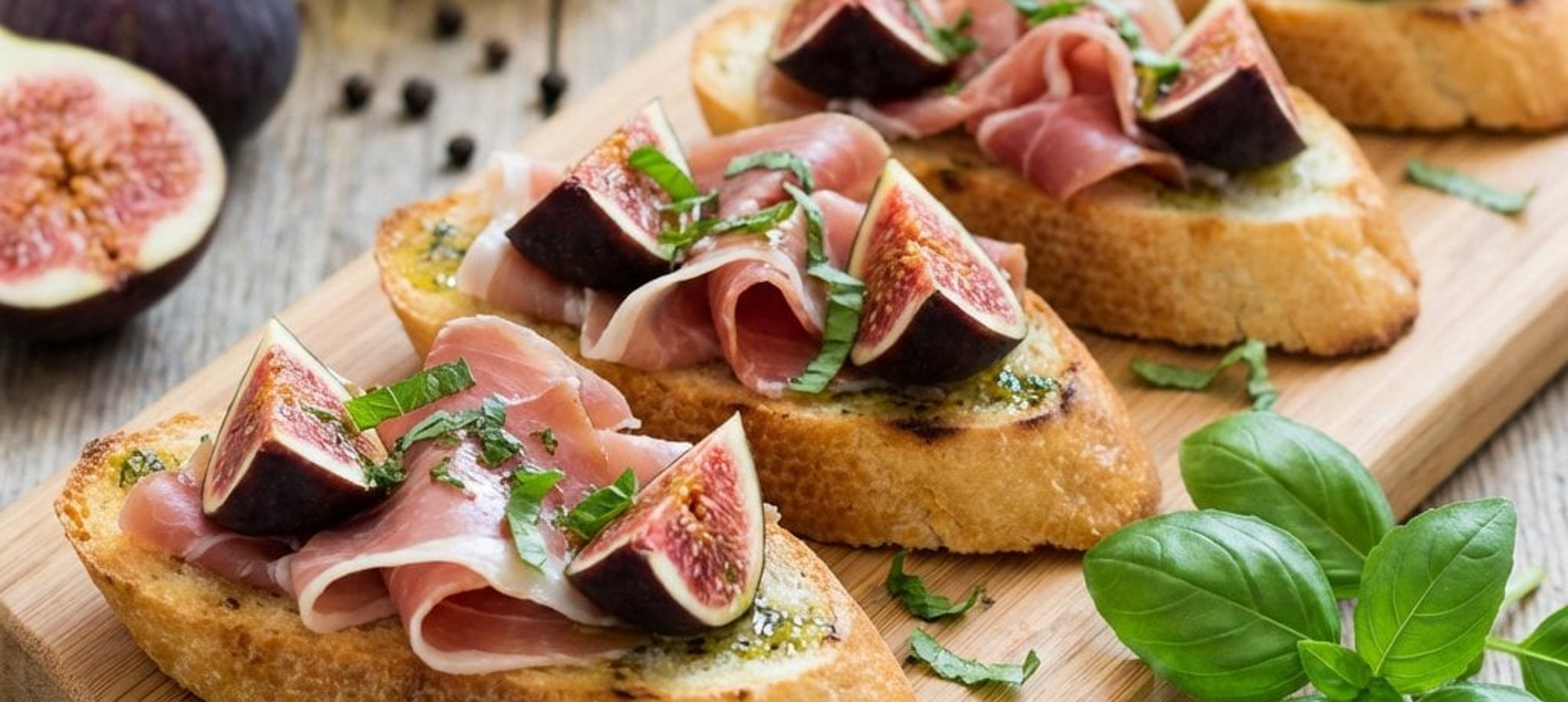 - 5Jedes Crostini mit einer halben Scheibe Prosciutto und einem Feigenviertel belegen. Mit etwas Salz bestreuen, mit einem Tropfen Öl verfeinern und mit der frisch gehackten Minze garnieren.