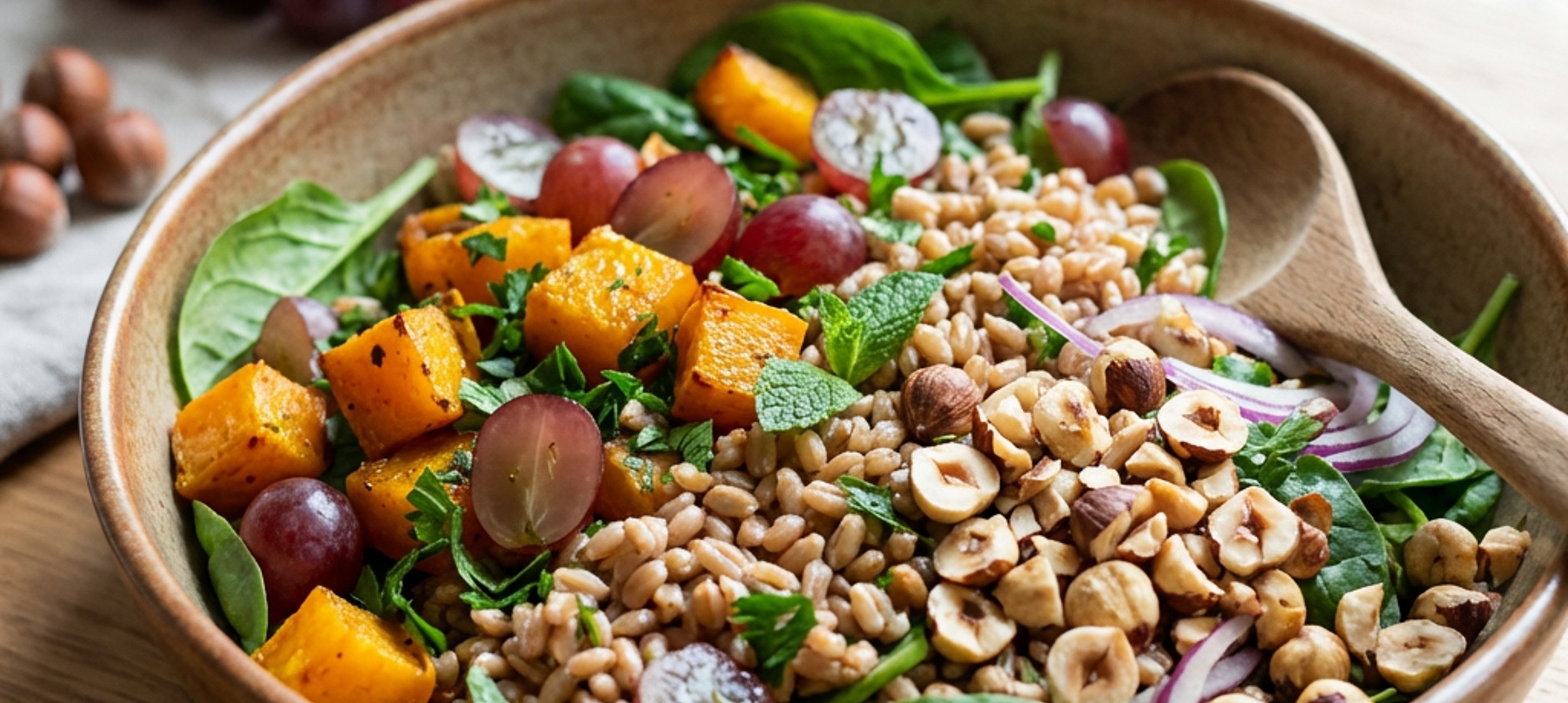 - 5Dressing zum Dinkel geben, vermengen und ca. 15 Min. ziehen lassen. Zwiebel, Babyspinat, Weintrauben, Kräuter, Haselnüsse und Kürbis dazugeben und gut vermengen.