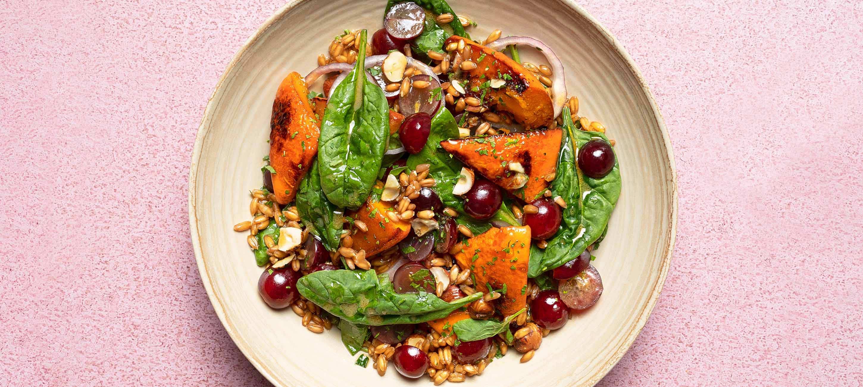 - 5Dressing zum Dinkel geben, vermengen und ca. 15 Min. ziehen lassen. Zwiebel, Babyspinat, Weintrauben, Kräuter, Haselnüsse und Kürbis dazugeben und gut vermengen.