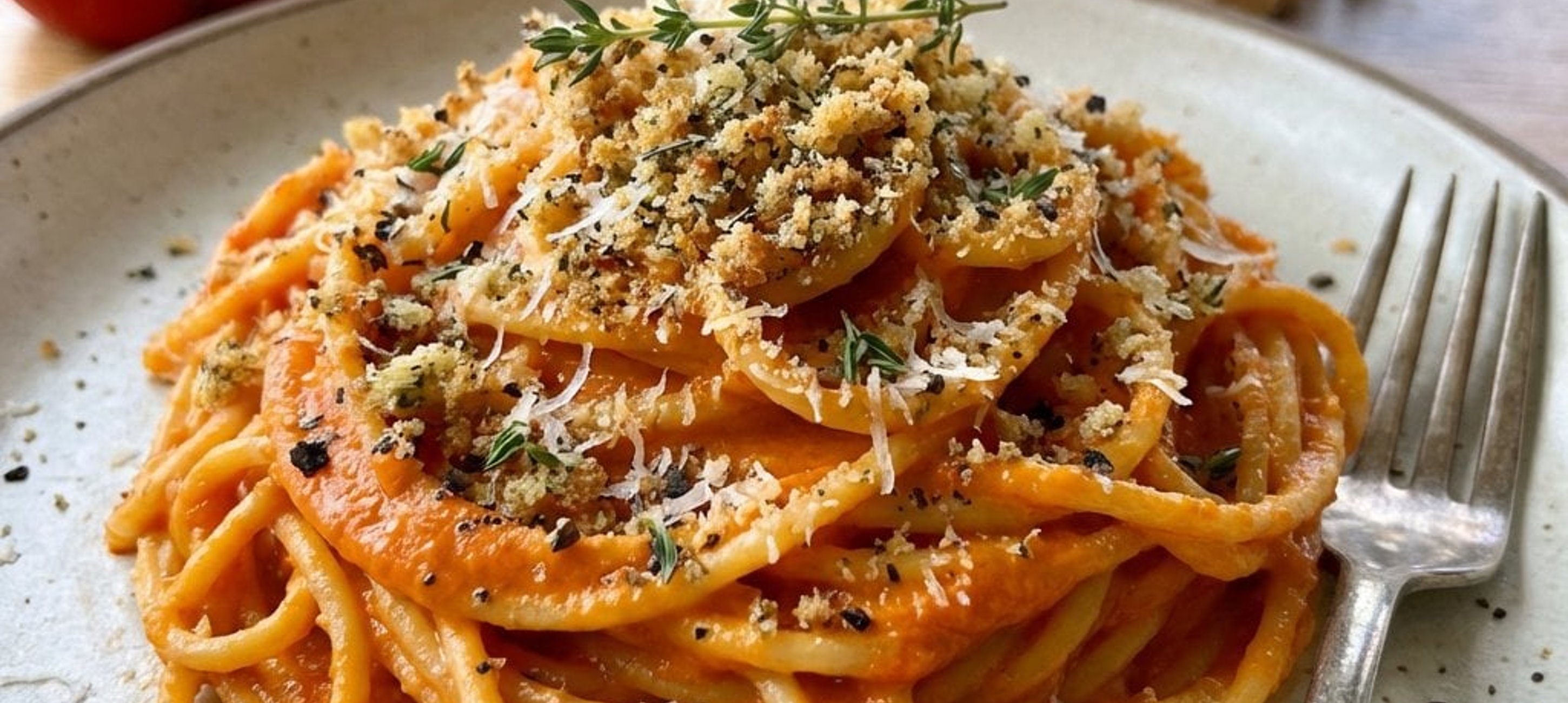 - 2Die Pasta auf Tellern anrichten und großzügig mit den Käsebröseln, frischen Kräutern und schwarzem Pfeffer bestreuen.