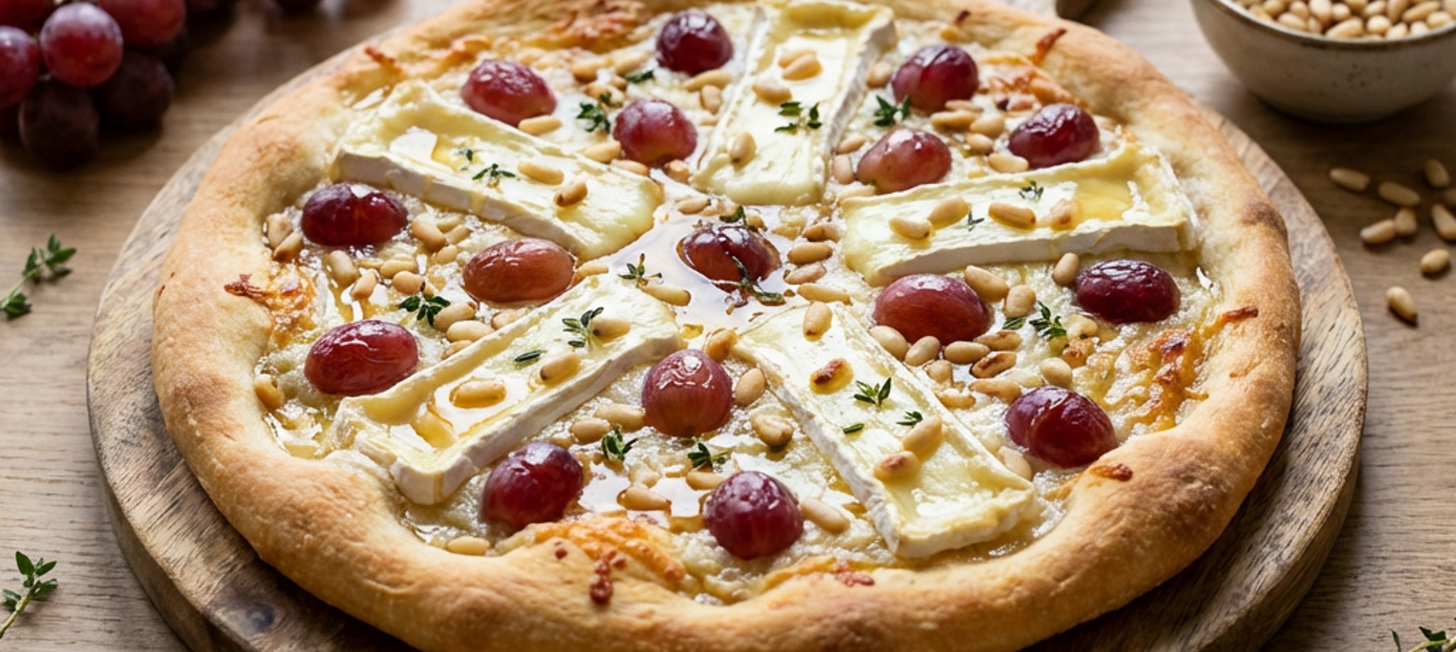 - 2Den vorgebackenen Teig aus dem Backofen nehmen und mit Frischkäse bestreichen. Mit Brie und Weintraubenbelegen. Honig darüber träufeln, Thymianblätter von den Zweigen zupfen und zusammen mit den Pinienkernen über die Pizza streuen. Mit Salz und Pfeffer würzen.