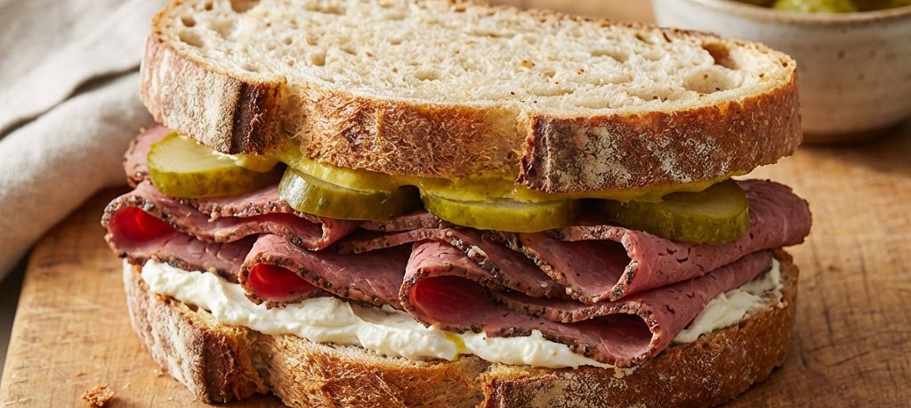 - 3Die Gewürzgurken in feine Scheiben schneiden und auf dem Fleisch verteilen. Mit der zweiten Brotscheibe zuklappen oder offen genießen.