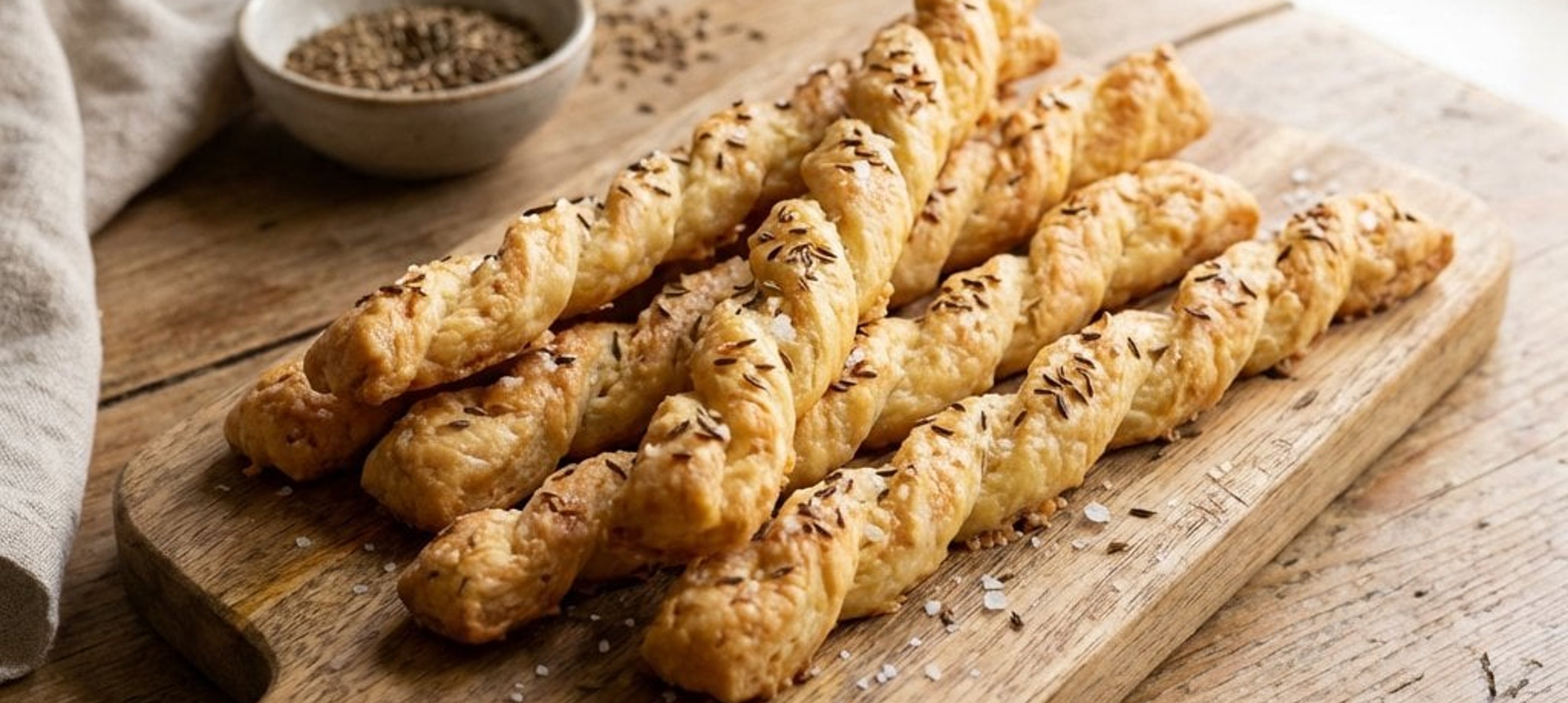 - 3Die Stangen mit dem verquirlten Ei bestreichen und großzügig mit Kümmel und grobem Meersalz bestreuen. Nach Belieben kann auch noch etwas zusätzlicher Käse darüber gegeben werden.
