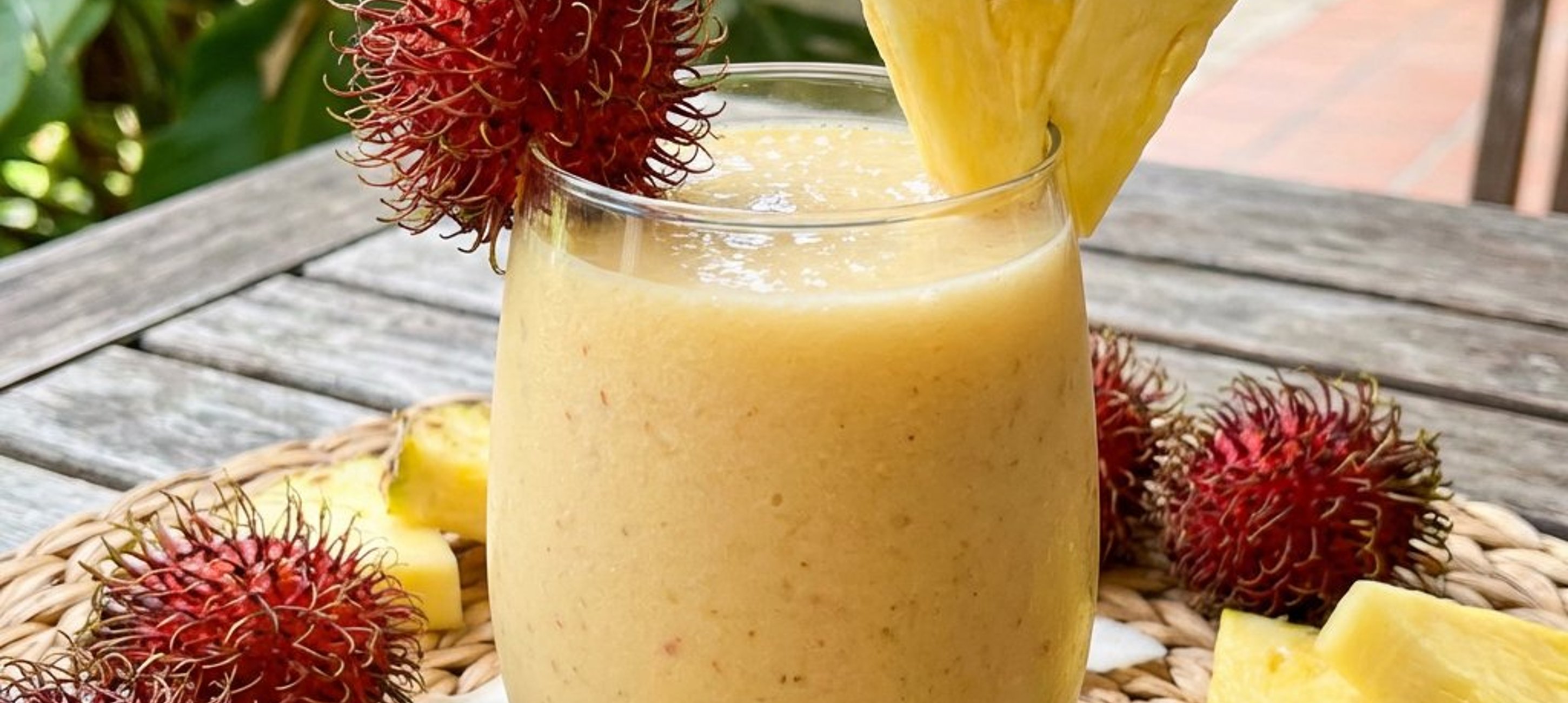 Servieren Sie den Smoothie in einem hohen Glas mit einem Strohhalm und garnieren Sie ihn nach Belieben mit einer frischen Rambutan oder einem Stück Ananas.