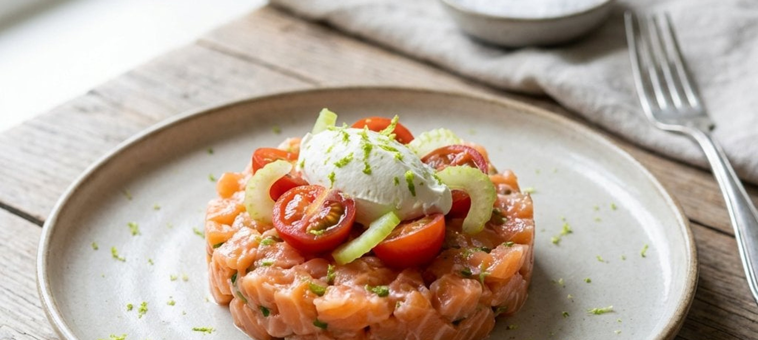 - 3Den Lachs fein würfeln (oder das fertige Tatar verwenden), vorsichtig darauf platzieren und mit frisch abgeriebener Limettenschale garnieren.