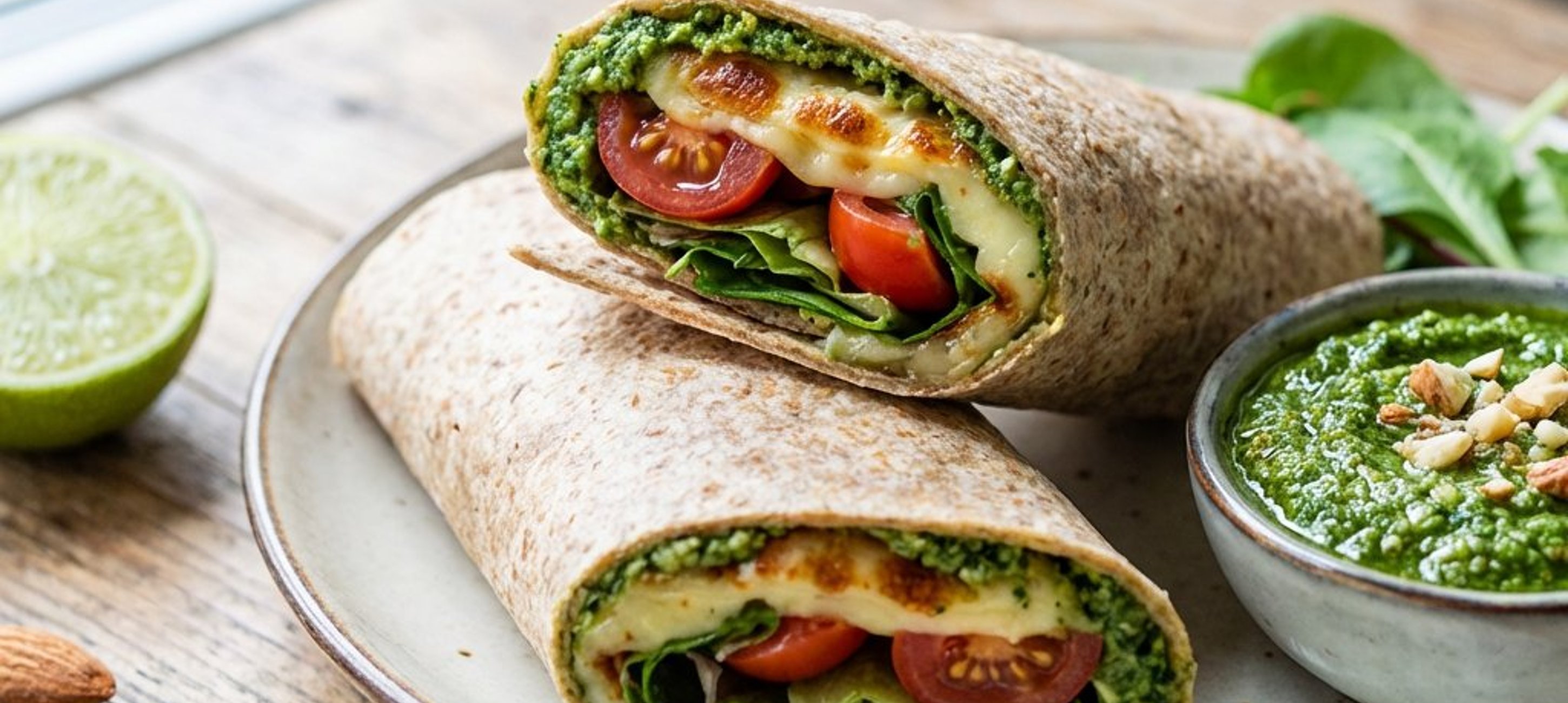 - 4Die Tortillas großzügig mit dem Spinatpesto bestreichen. Den Salat-Mix und die Tomaten darauf verteilen und zum Schluss den gegrillten Käse darauflegen.
