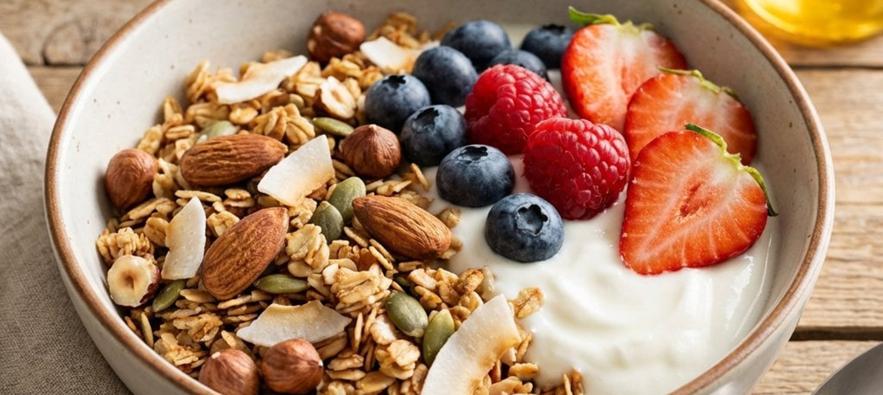 - 1Servieren Sie das Granola mit Naturjoghurt und frischen Beeren. Nach Belieben können Sie gehackte Zartbitterschokolade, gefriergetrocknete Früchte oder Kokoschips hinzufügen.