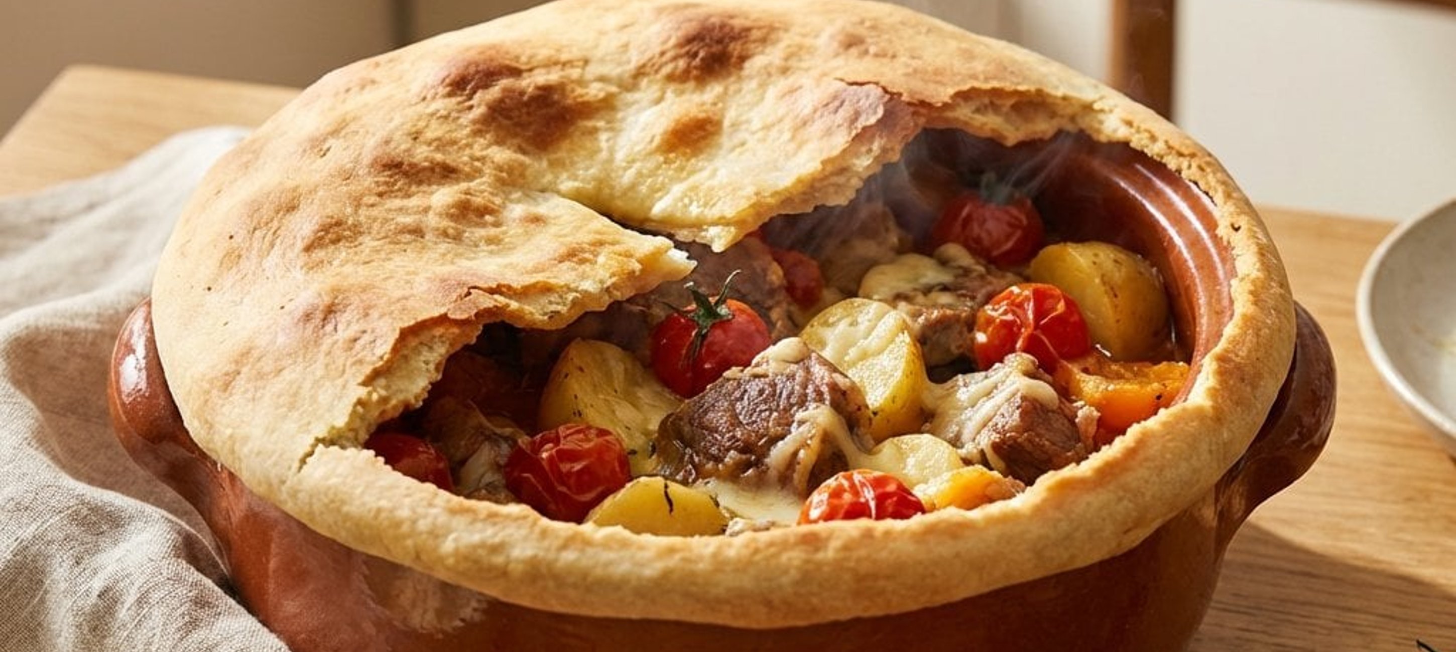 - 315 Minuten vor Ende der Garzeit den Deckel des Topfes entfernen. Den Teig ausrollen und als Haube über den Topf legen. An den Rändern gut festdrücken, damit der Dampf im Topf bleibt. Zu Ende backen, bis der Teig goldbraun ist.