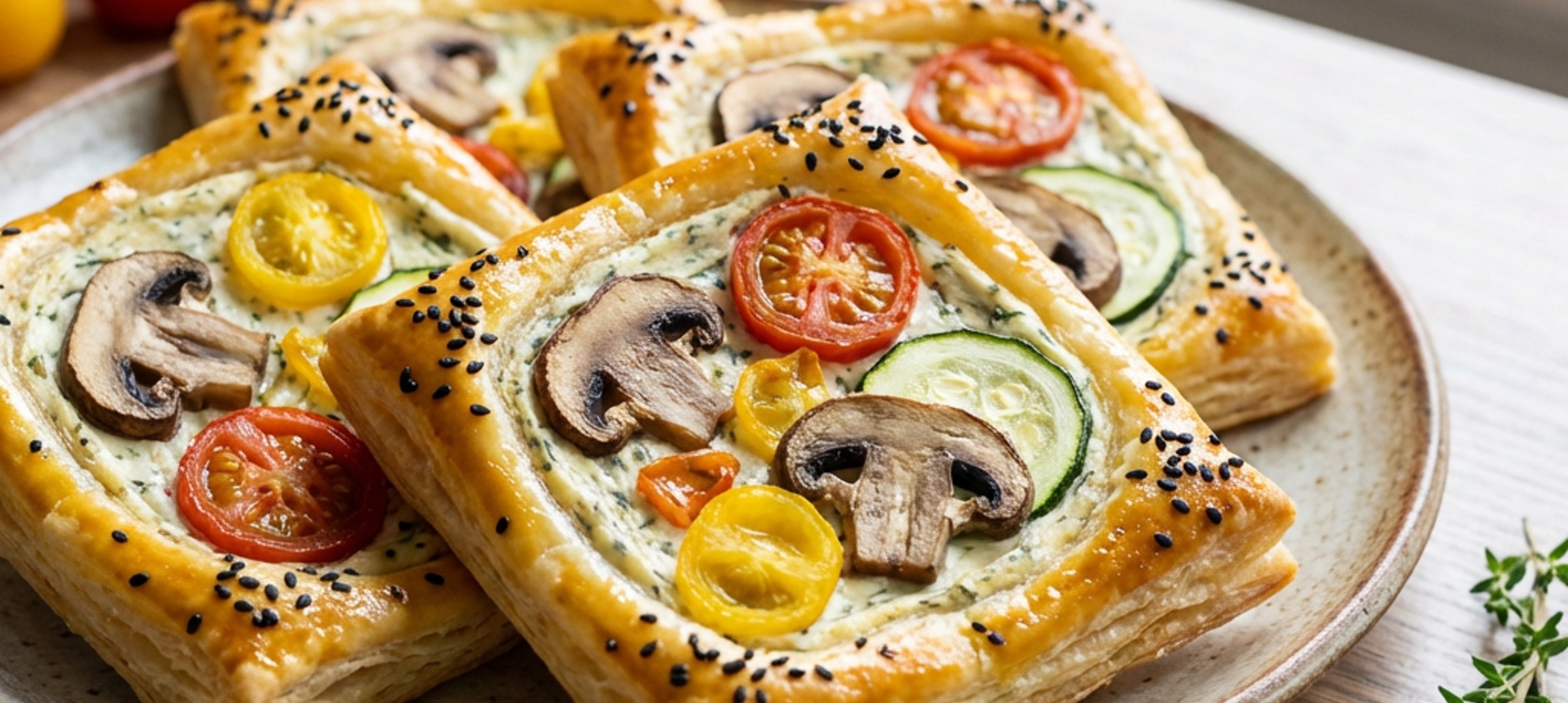 - 2Crème fraîche mit Salz, Pfeffer und Kräutern vermischen. Masse dünn auf dem Blätterteig verteilen. Tomaten, Champignons und Zucchini in dünne Scheiben schneiden. Die Blätterteig-Rechtecke mit dem Gemüse belegen.