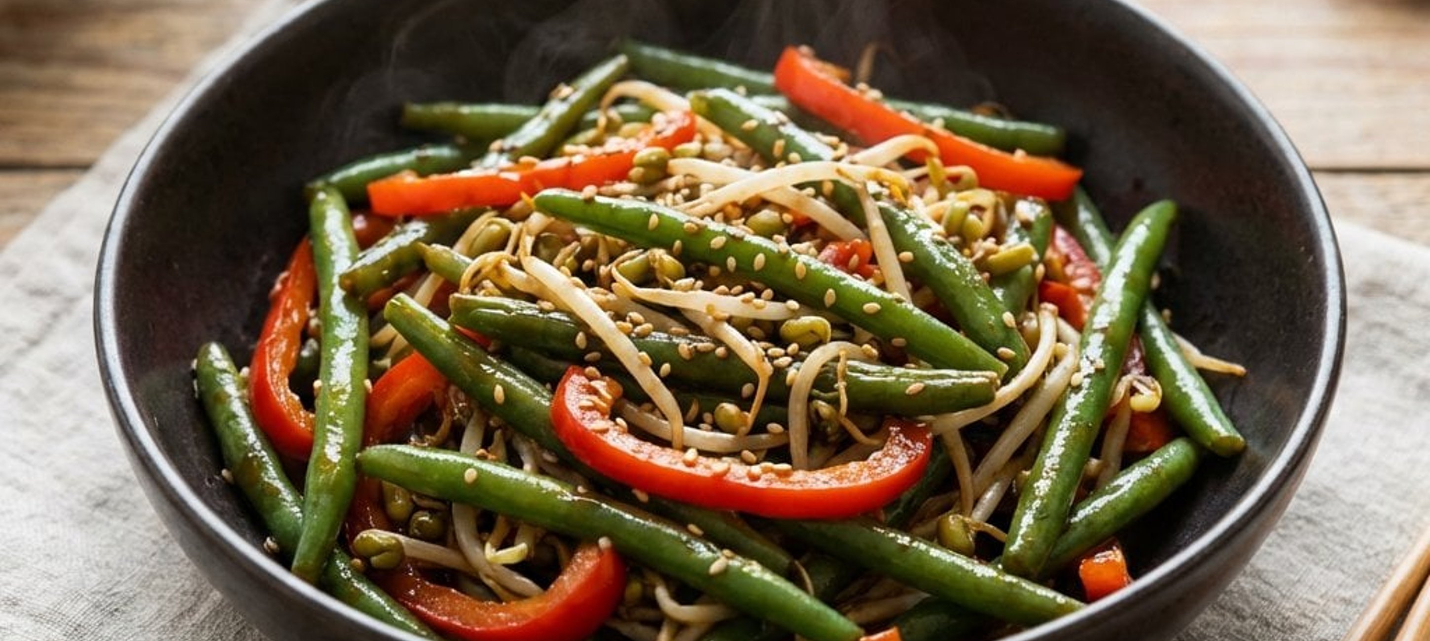 - 2Das Pflanzenöl im Wok erhitzen. Den fein gewürfelten Knoblauch und den geriebenen Ingwer darin kurz anbraten. Die grünen Bohnen hinzufügen und unter Rühren braten, bis sie fast gar sind. Dann die Mungobohnenkeimlinge und die in Streifen geschnittene rote Paprika hinzufügen und weitere 2 Minuten pfannenrühren.