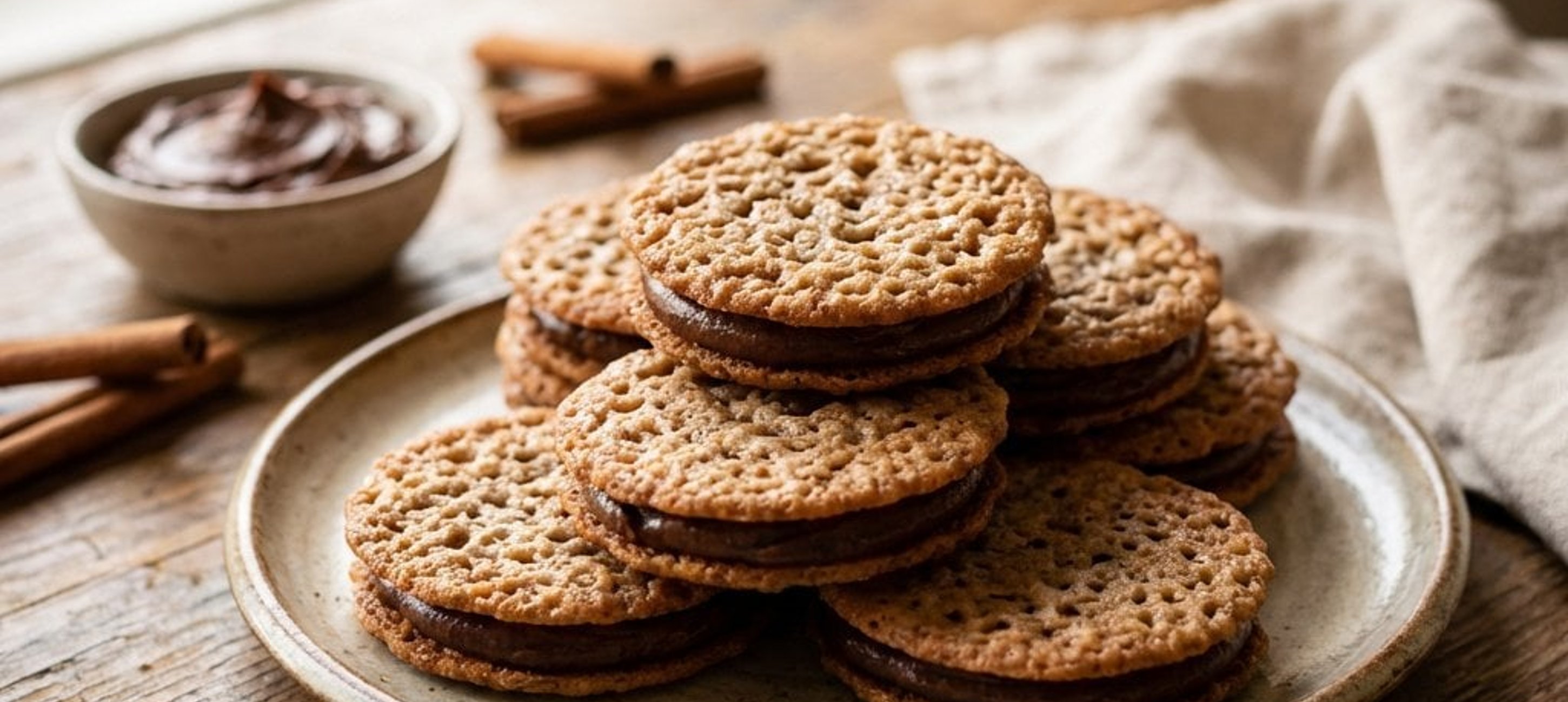 - 2Die ausgekühlten Kekse mit der vorbereiteten Füllung paarweise zusammensetzen. Tipp: Für eine besondere Optik den Rand mit der Schokocreme spritzen und die Mitte mit Pflaumenmus oder Marmelade füllen.