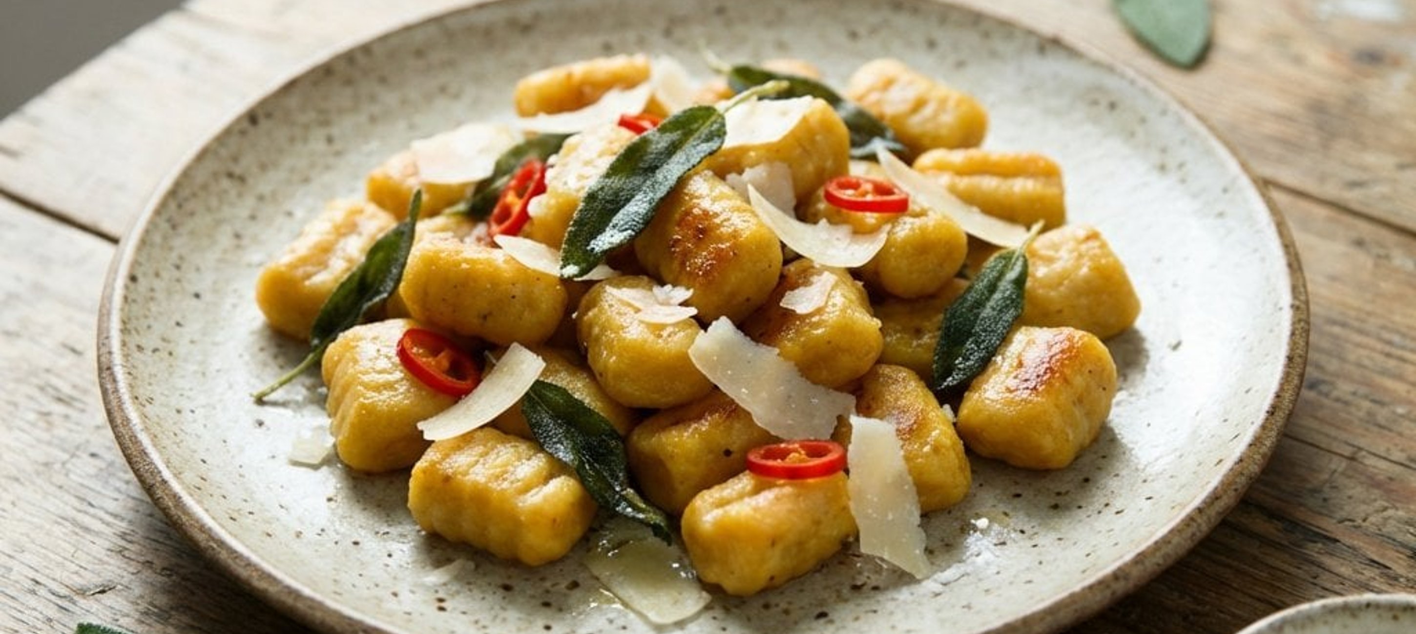 - 3Die Kürbis-Gnocchi auf Tellern anrichten und mit frisch geriebenem Parmesan bestreuen.