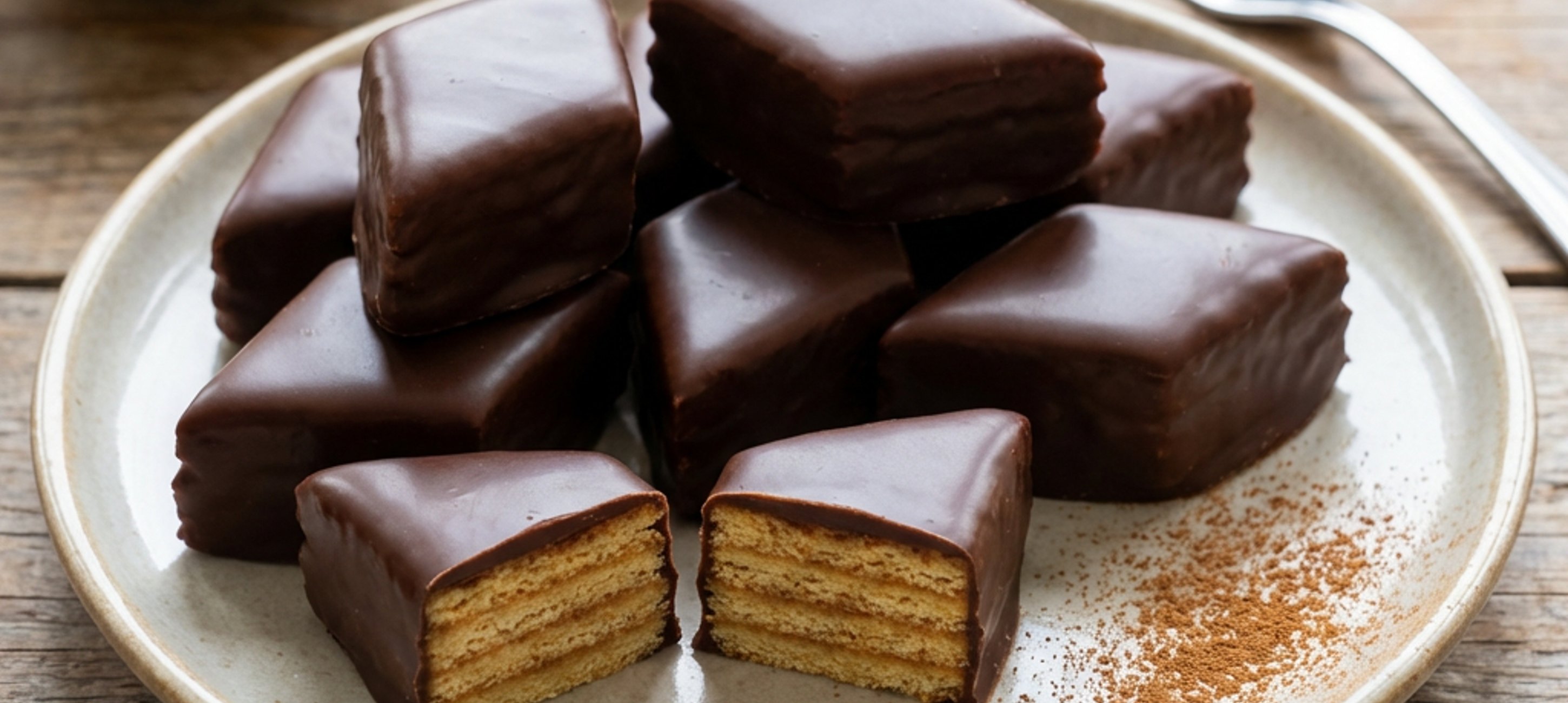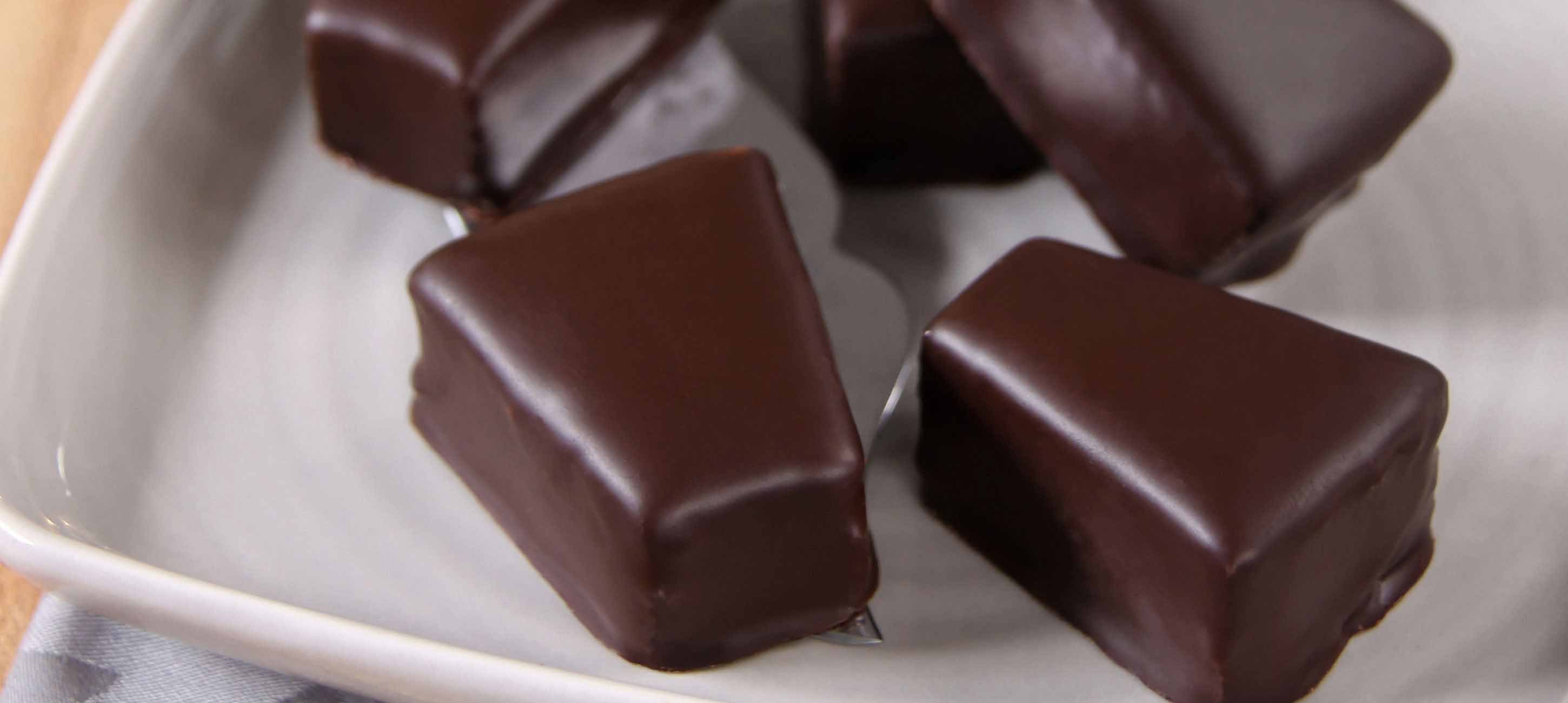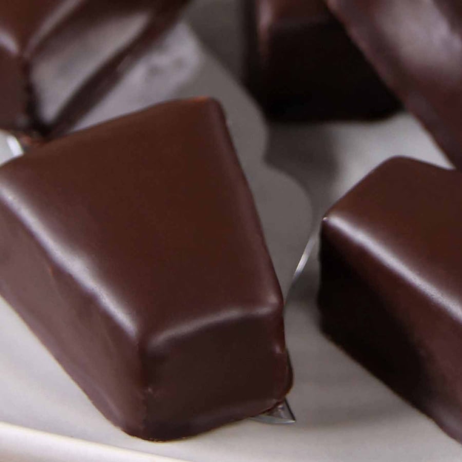- 4Anschließend abkühlen lassen und in kleine Rauten schneiden. Die Rauten mit der geschmolzenen Kuvertüre überziehen und fest werden lassen. Fertig sind deine Baumkuchenspitzen!