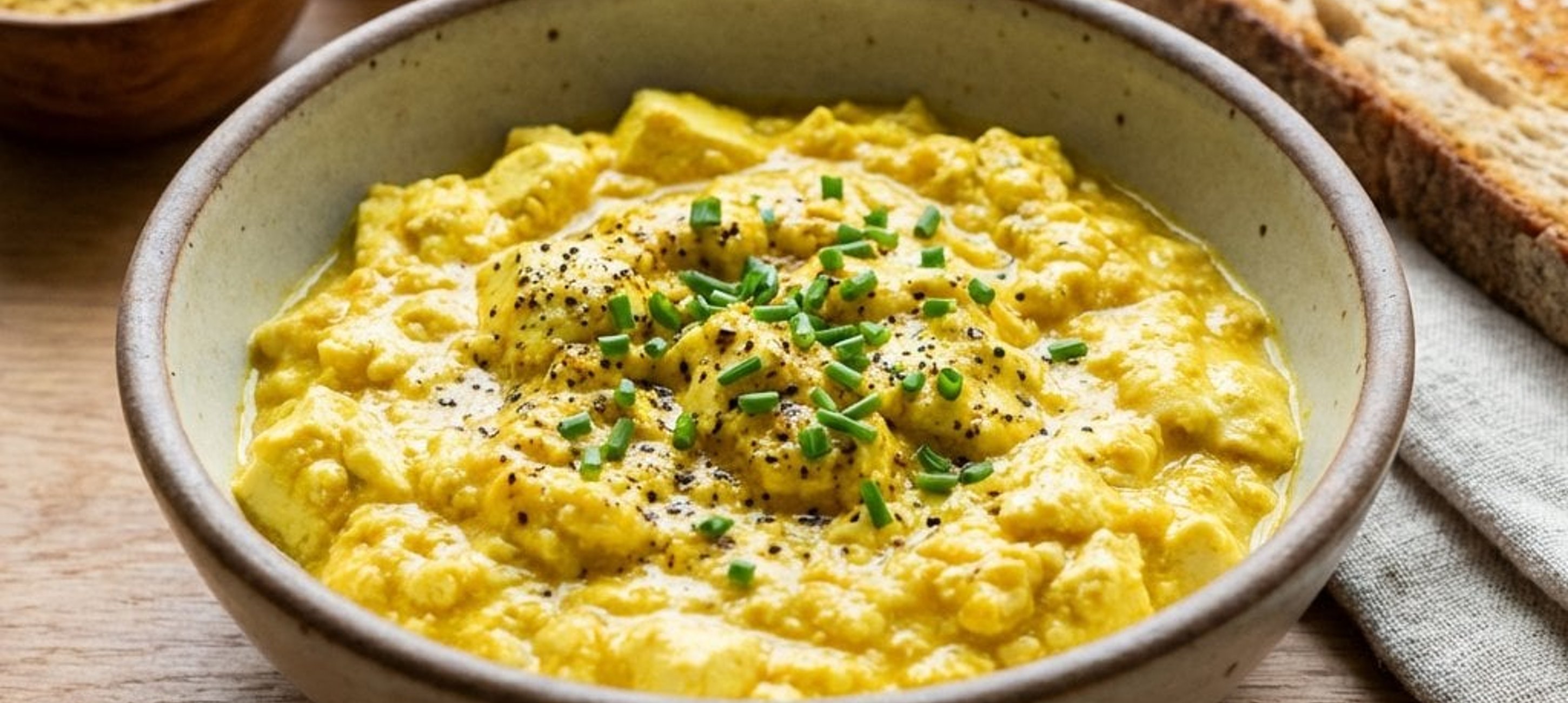 - 4Das vegane Rührei mit frischem Brot und knackigem Gemüse nach Wahl servieren.