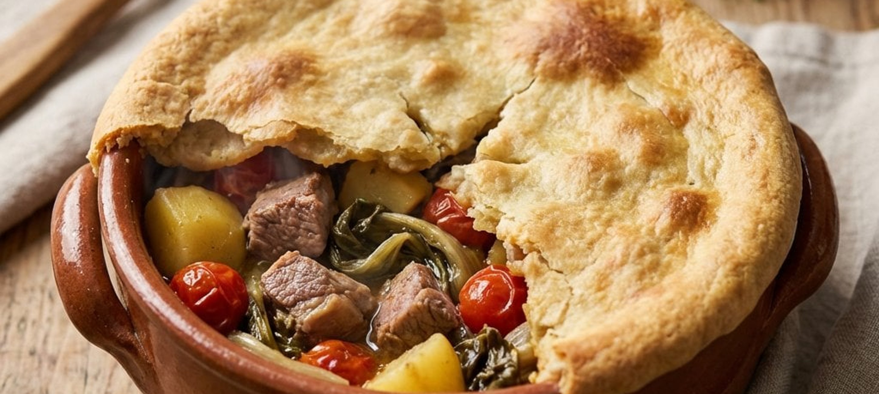 - 6Den Topf aus dem Ofen nehmen, die Teigkruste vorsichtig aufschneiden und den duftenden Eintopf direkt in tiefen Tellern servieren. Die gebackene Kruste dient dabei als köstliche Beilage.