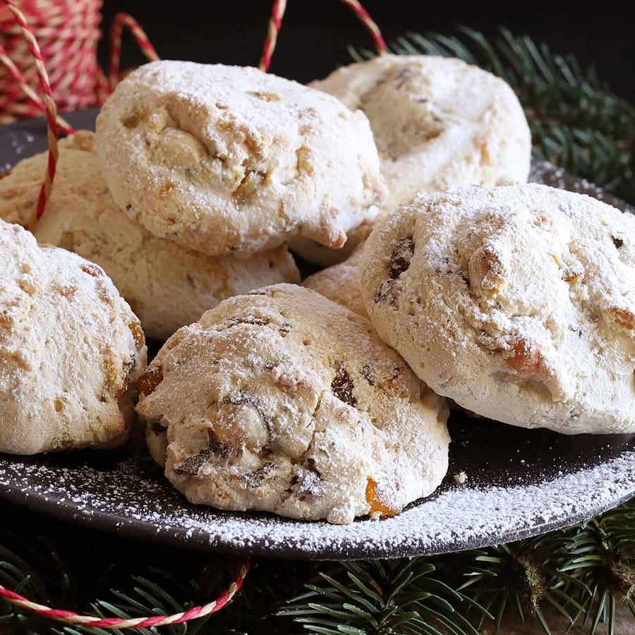 - 2Kastaniengroße Bällchen formen und in Puderzucker wälzen. Evtl. in der Mitte mit einer abgezogenen Mandel garnieren und auf ein mit Backpapier belegtes Backblech mit Abstand zueinander legen und leicht andrücken. Bei 180°C Ober- und Unterhitze ca. 12 Minuten backen.