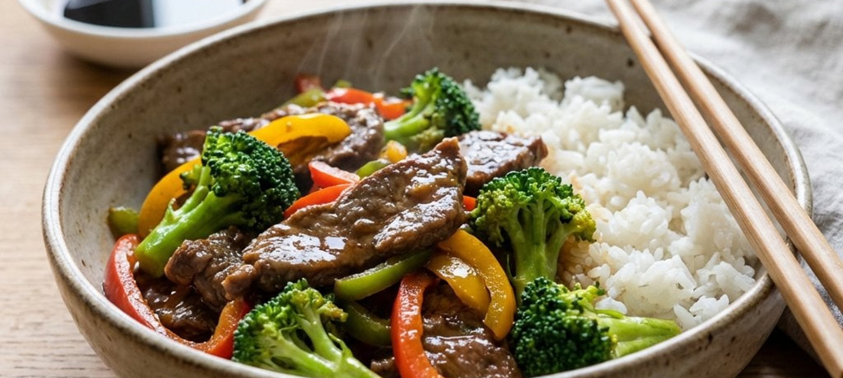 - 1Das Rinderfilet in sehr feine Streifen schneiden. Den Brokkoli in kleine Röschen teilen, Karotten in feine Stifte und die Paprika in dünne Streifen schneiden. Den Reis nach Packungsanweisung in Salzwasser garen.