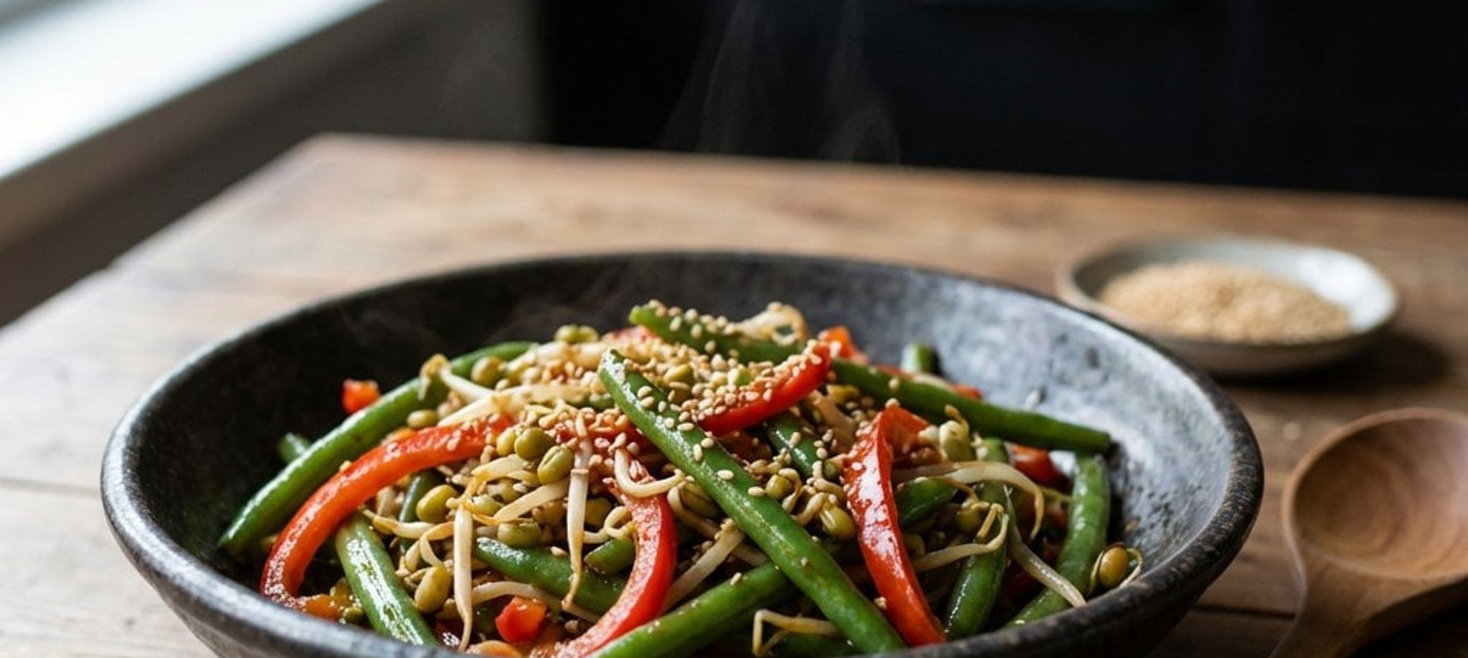- 2Das Pflanzenöl im Wok erhitzen und Knoblauch sowie Ingwer darin kurz anbraten. Die grünen Bohnen hinzufügen und unter Rühren braten, bis sie fast gar sind. Dann die Mungobohnenkeimlinge und die rote Paprika hinzufügen und weitere 2 Minuten pfannenrühren.
