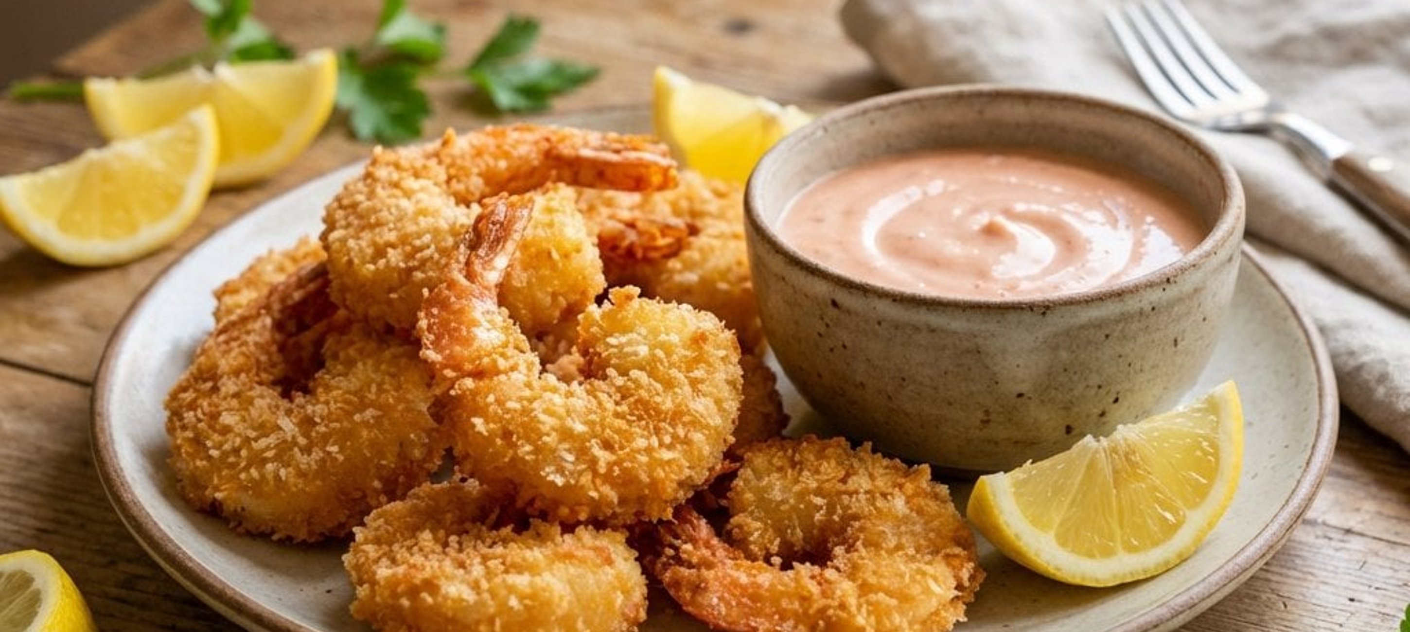- 2Die knusprigen Garnelen mit dem restlichen Zitronensaft beträufeln und zusammen mit dem gekühlten Cocktail-Dressing servieren.