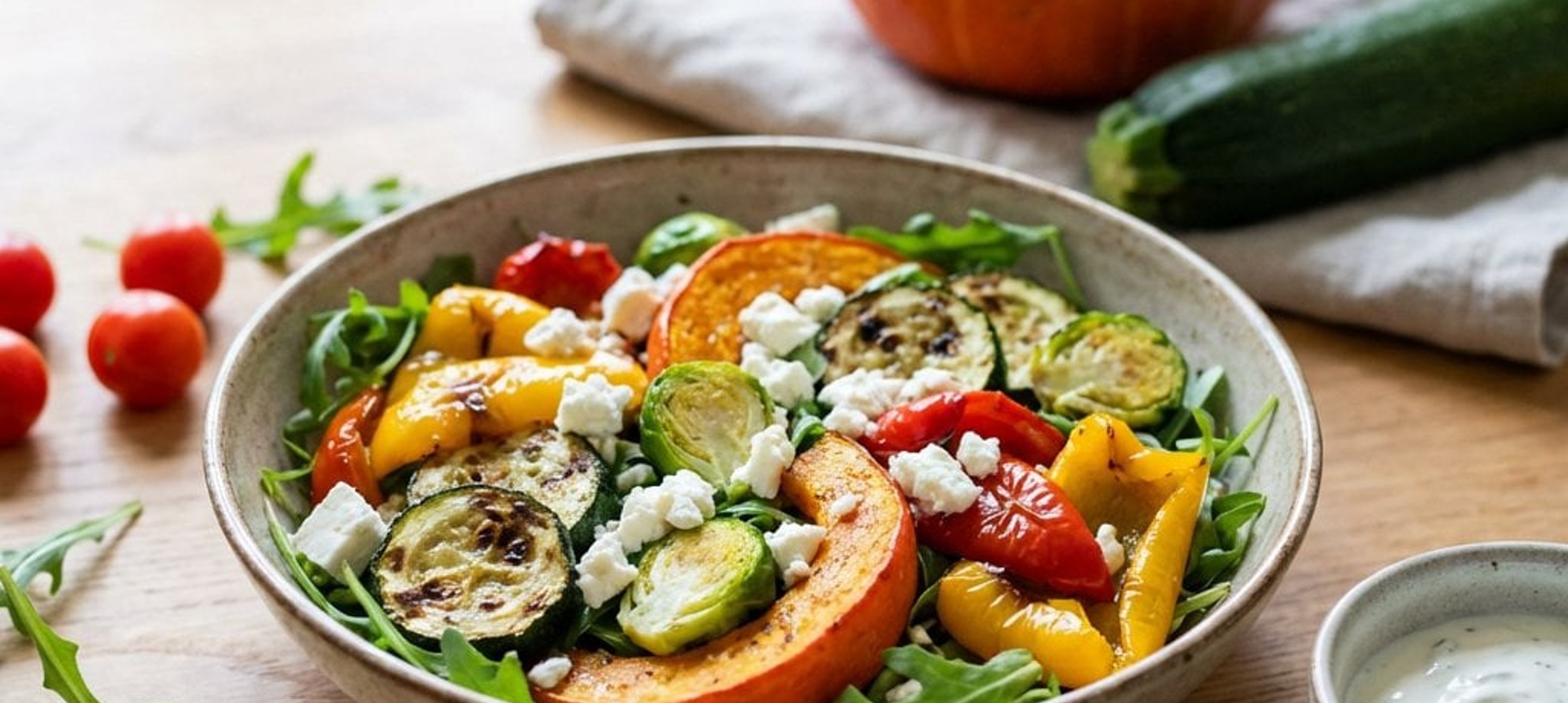 - 1Das geröstete Gemüse kurz abkühlen lassen, dann mit dem frischen Rucola und dem zerbröselten Feta-Käse in einer großen Schüssel vermengen.