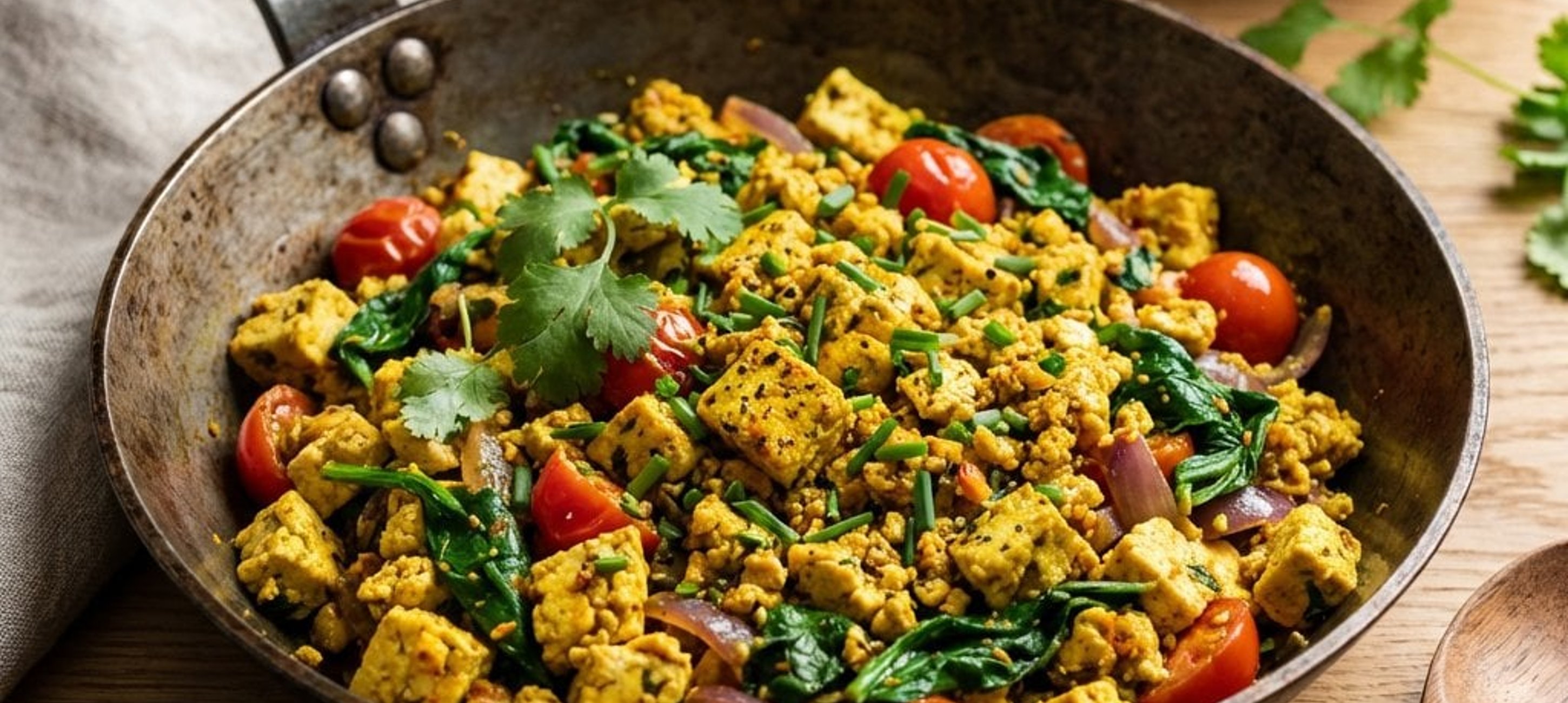 - 4Das vegane Rührei mit frischem Gemüse und knusprigem Brot servieren.