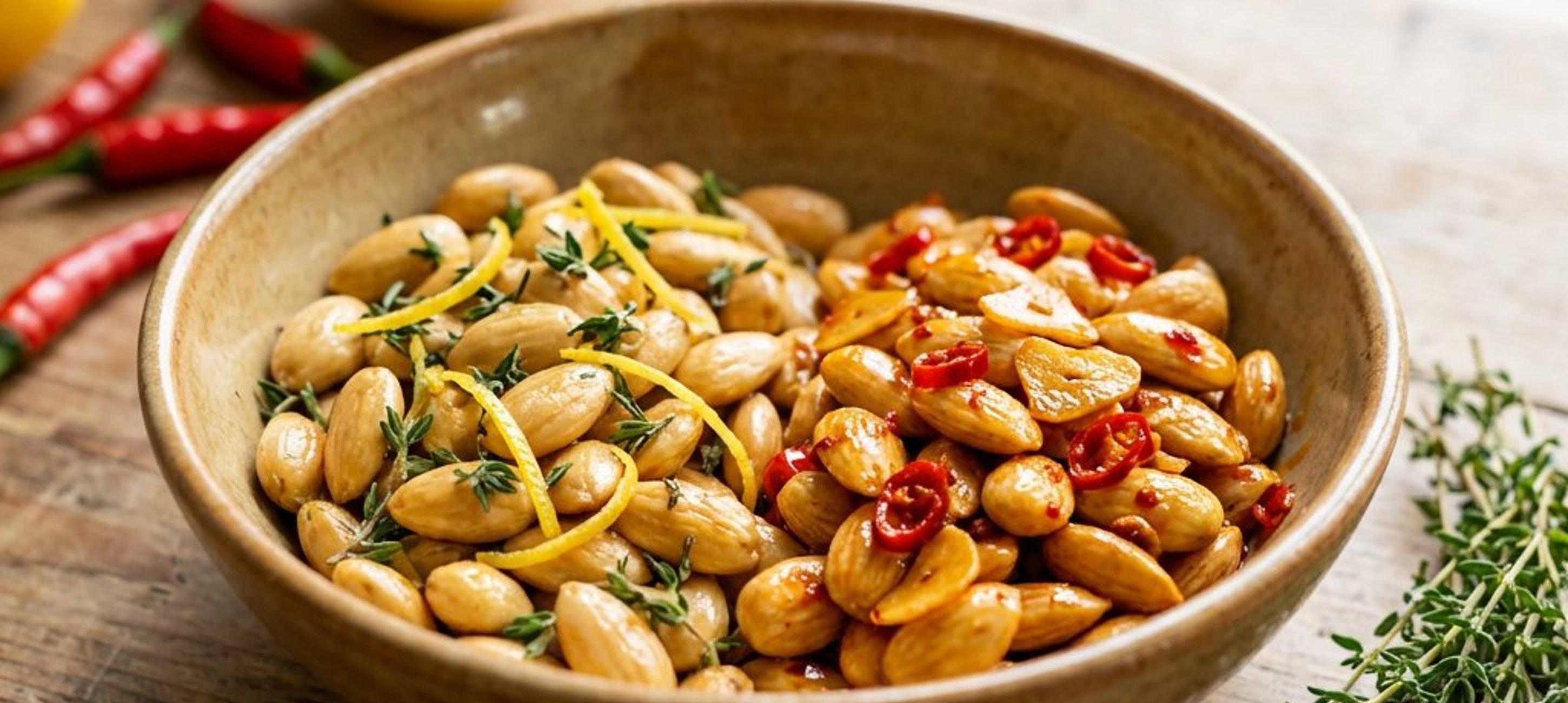 - 1Für die Thymian-Zitronen-Variante: 200 g Mandeln in einer trockenen Pfanne ohne Fett rösten. Die abgezupften Thymianblättchen, Zitronenabrieb und die Hälfte des Salzes hinzufügen. Mit Zitronensaft beträufeln und unter ständigem Rühren goldbraun rösten. Aus der Pfanne nehmen und abkühlen lassen.