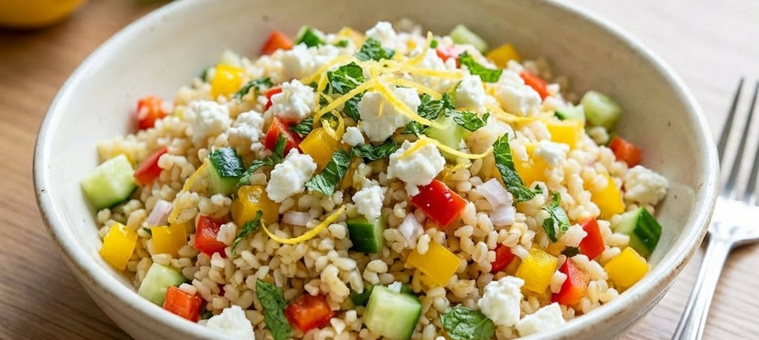 - 4Den Feta-Käse über den Bulgur und das Gemüse bröseln. 2 EL Olivenöl, fein geriebene Zitronenschale, Zitronensaft und die fein gehackte frische Minze hinzufügen. Mit Salz und Pfeffer abschmecken und alles gut vermengen.