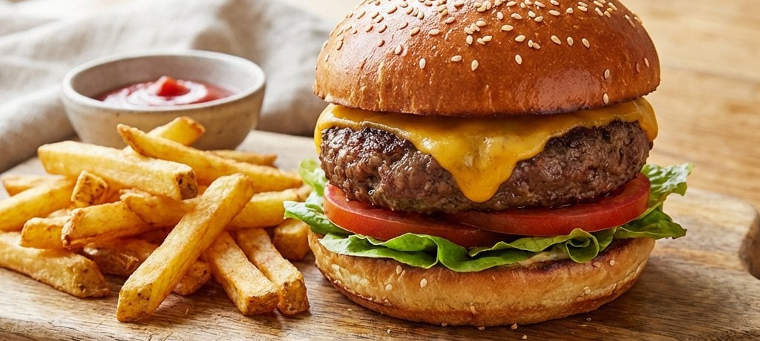 - 3Die vorbereitete Sauce auf beide Brötchenhälften streichen. Auf die Unterseite Tomatenscheiben, Salat und das Fleisch schichten. Mit der oberen Brötchenhälfte abdecken und zusammen mit den heißen Pommes servieren.