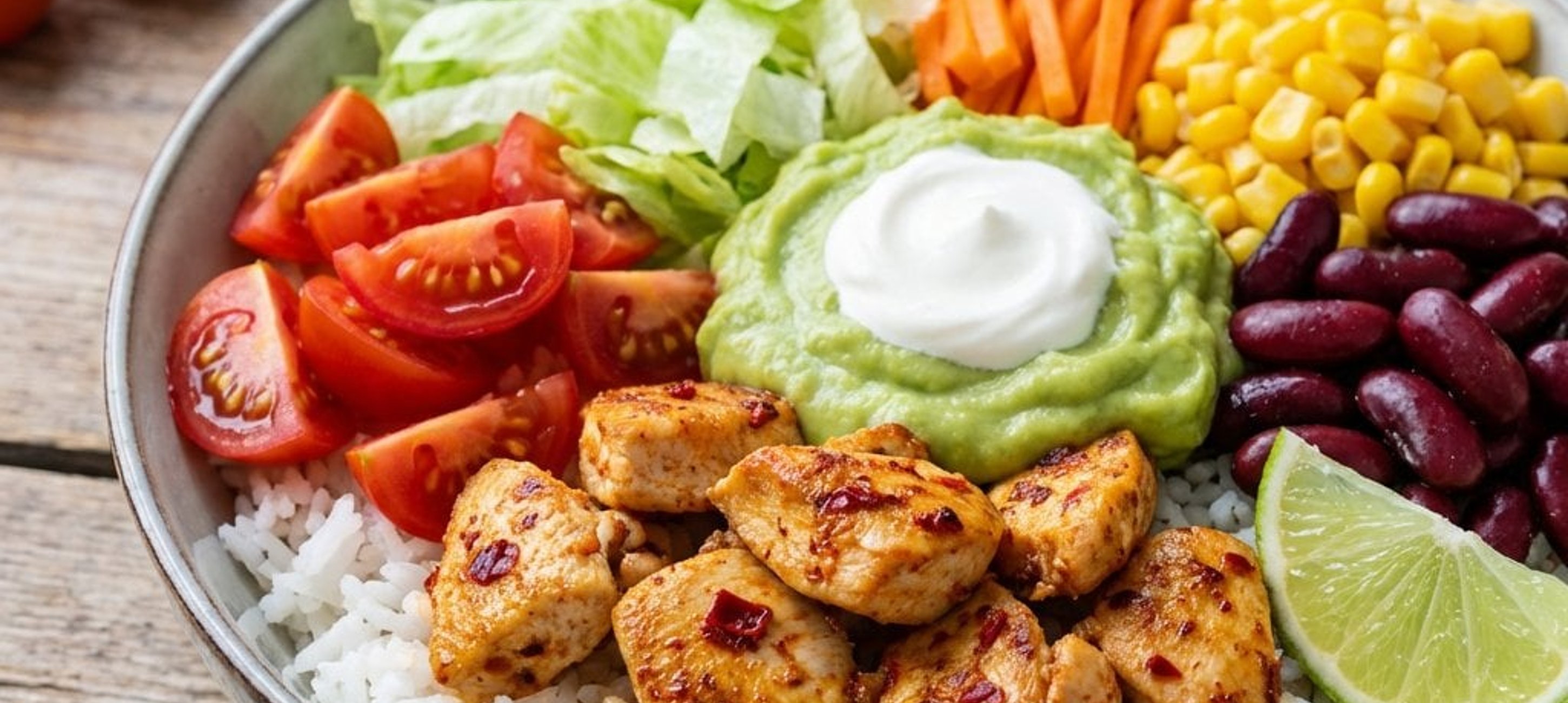 - 1Zum Schluss die Bowls zusammenstellen: Den warmen Reis als Basis in die Schüsseln geben. Das gebratene Hähnchen, die vorbereiteten Gemüsesorten (Karotten, Tomaten, Salat, Mais, Bohnen) und die Avocado-Creme dekorativ darauf anrichten. Mit einem Klecks saurer Sahne garnieren und sofort genießen.