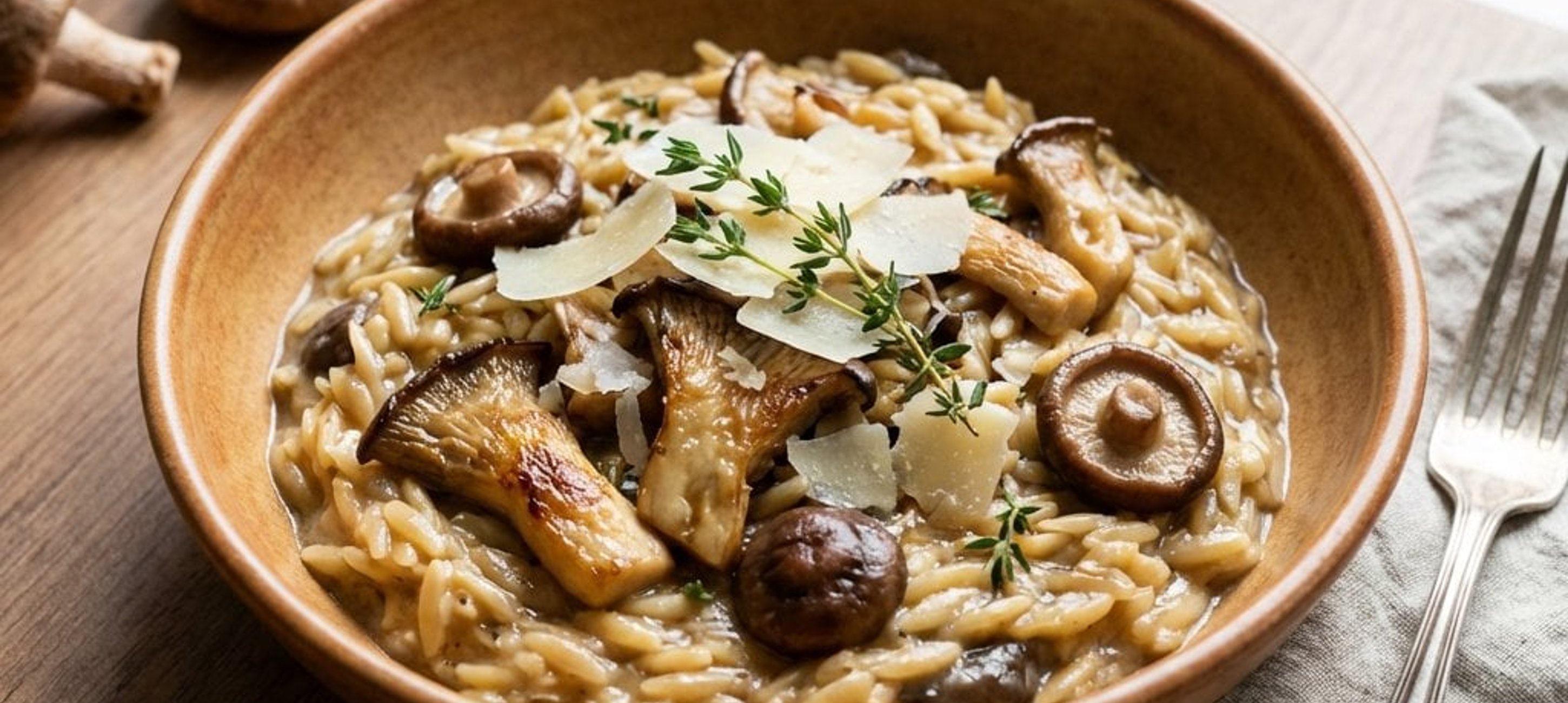 - 1Die Orzo-Nudeln zu den Pilzen in die Pfanne geben und kurz mitrösten. Den gehackten Thymian hinzufügen. Mit der Gemüsebrühe aufgießen und bei mittlerer Hitze ca. 10 Minuten köcheln lassen, bis die Nudeln weich sind und die Flüssigkeit fast vollständig aufgesogen wurde. Bei Bedarf noch etwas Brühe oder Wasser nachgießen.