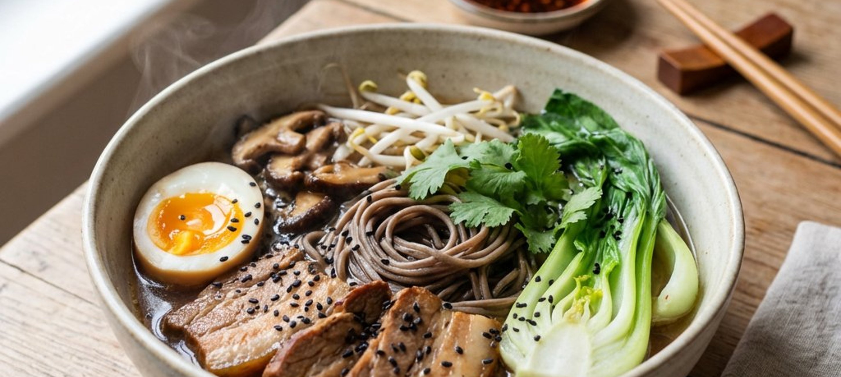 - 1Eine Portion Soba-Nudeln, Fleisch und gebratene Pilze in tiefe Schalen geben. Sprossen und die Eihälften hinzufügen. Mit der heißen Brühe aufgießen und mit schwarzem Sesam sowie nach Belieben mit Chilischoten bestreut servieren.