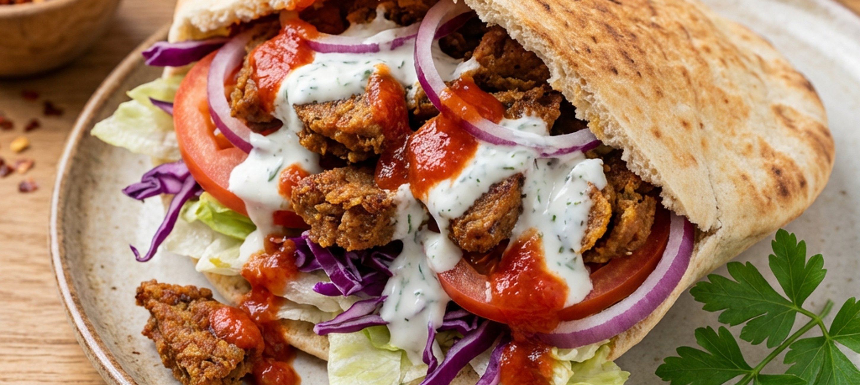 - 4Die Fladenrote halbieren und auf- aber nicht ganz durchschneiden. Kurz im Ofen erwärmen und dann mit Salat, Gemüse, plant based Gyros und den Soßen belegen und servieren.