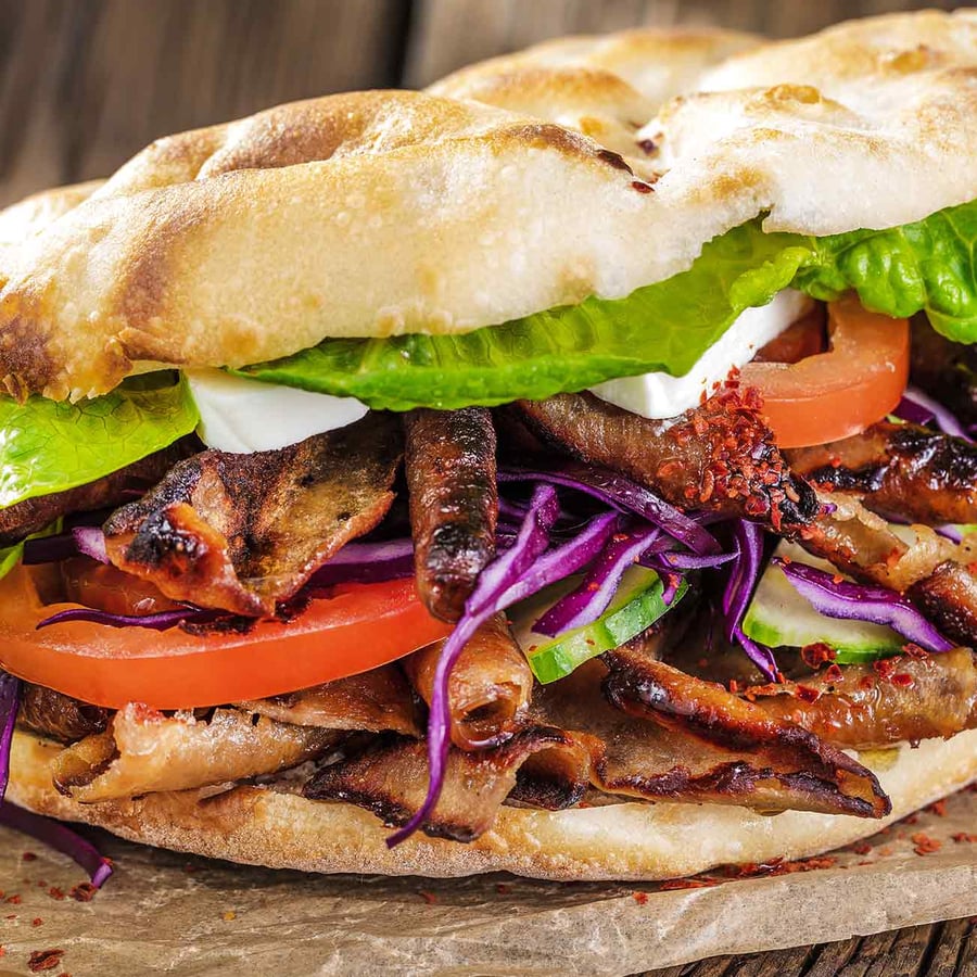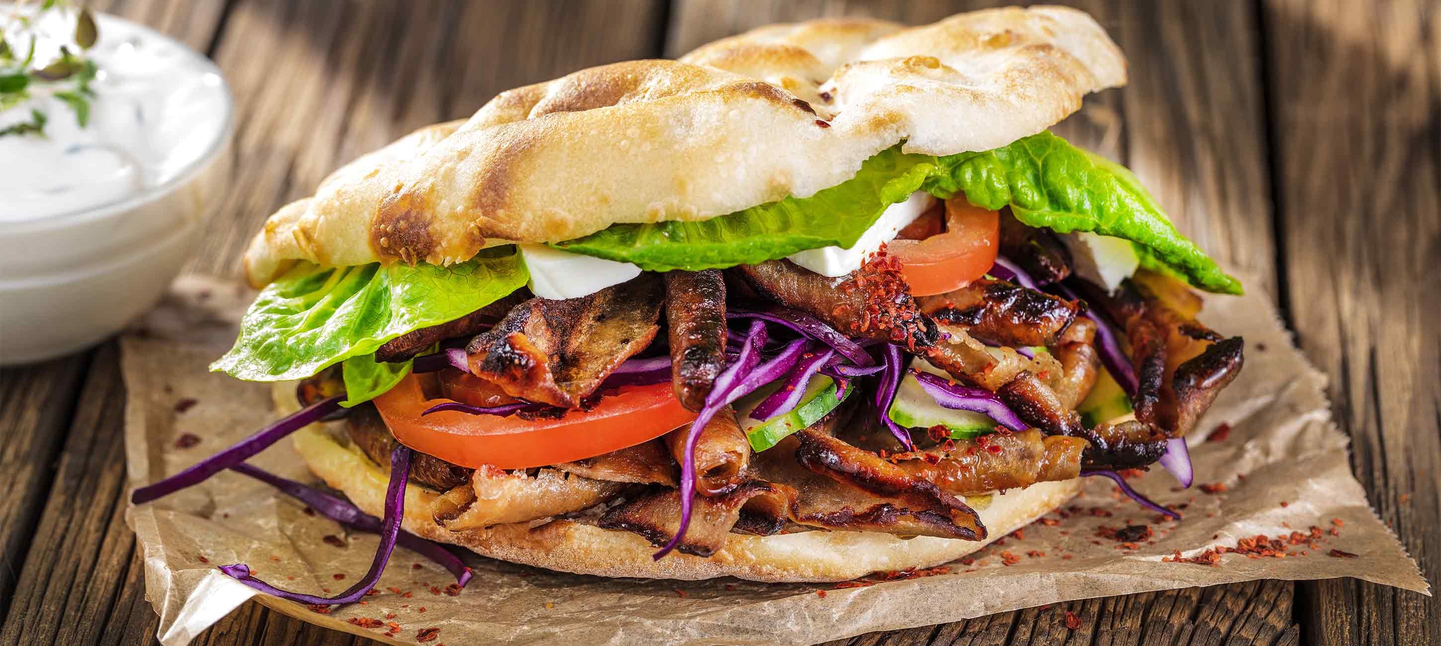 - 4Die Fladenrote halbieren und auf- aber nicht ganz durchschneiden. Kurz im Ofen erwärmen und dann mit Salat, Gemüse, plant based Gyros und den Soßen belegen und servieren.