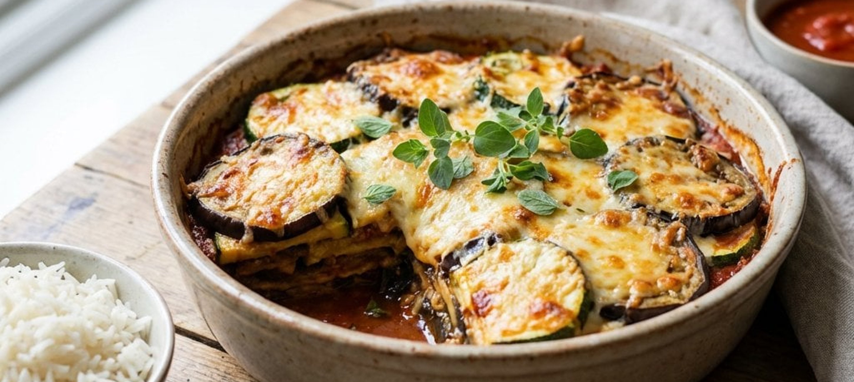 - 2In einer weiteren großen Pfanne 1 EL Rapsöl erhitzen und die Auberginen- und Zucchini-Scheiben von beiden Seiten ca. 1–1,5 Minuten goldbraun anbraten. Den Ofen auf 180 °C vorheizen. Eine Auflaufform (ca. 20 x 30 cm) vorbereiten. Zuerst eine Schicht Auberginen leicht überlappend am Boden verteilen. Darauf einen Teil der Fleischsauce geben. Es folgt eine Schicht Zucchini, wieder Fleischsauce, dann die restlichen Auberginen und die restliche Sauce. Den geriebenen Parmesan gleichmäßig darüber streuen. Im Ofen bei 180–185 °C ca. 55–65 Minuten goldbraun backen.