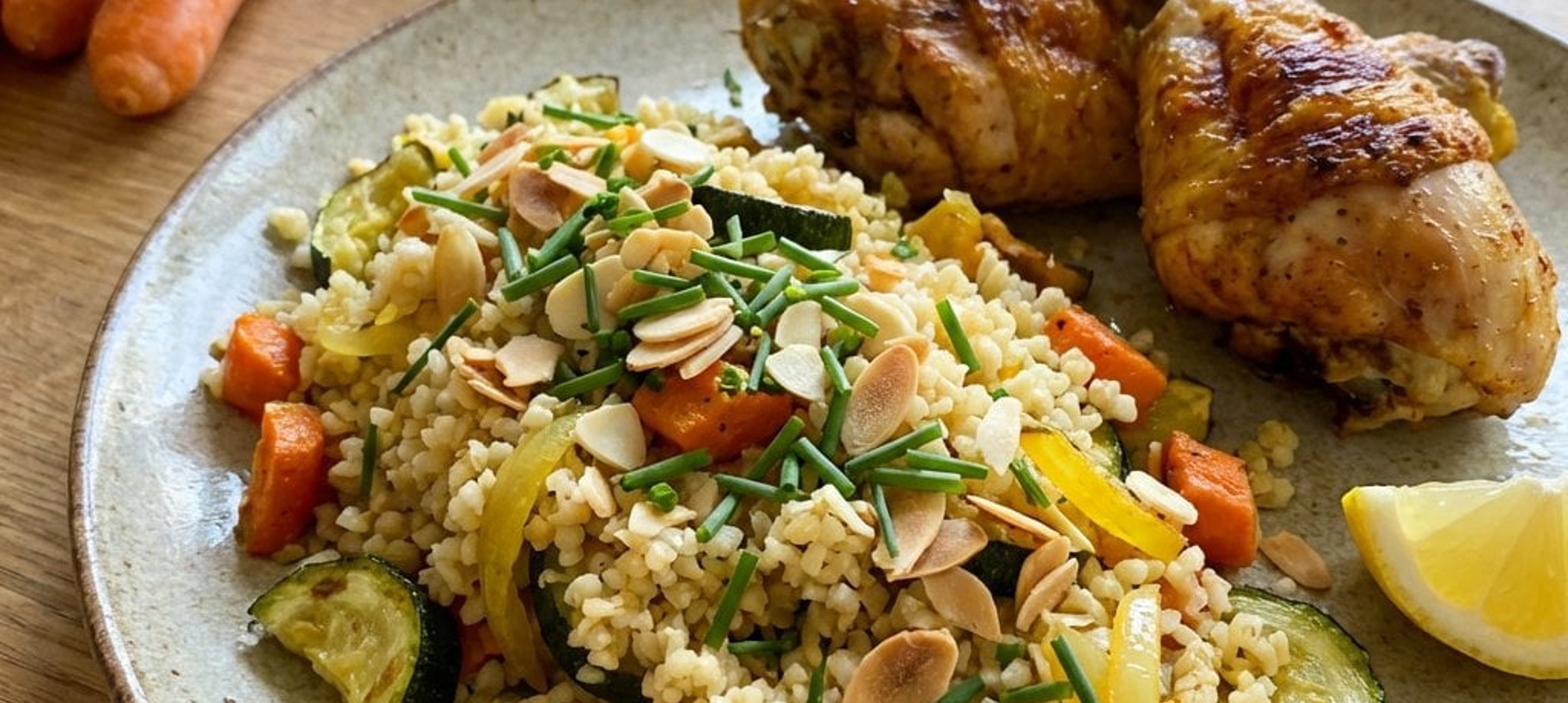 - 2Das abgekühlte Hähnchen auf einen Teller legen und das Fleisch von den Knochen lösen. Das geröstete Gemüse aus der Form zusammen mit dem Schnittlauch und den Mandelblättern zum Bulgur in die Schüssel geben und alles gut vermengen.