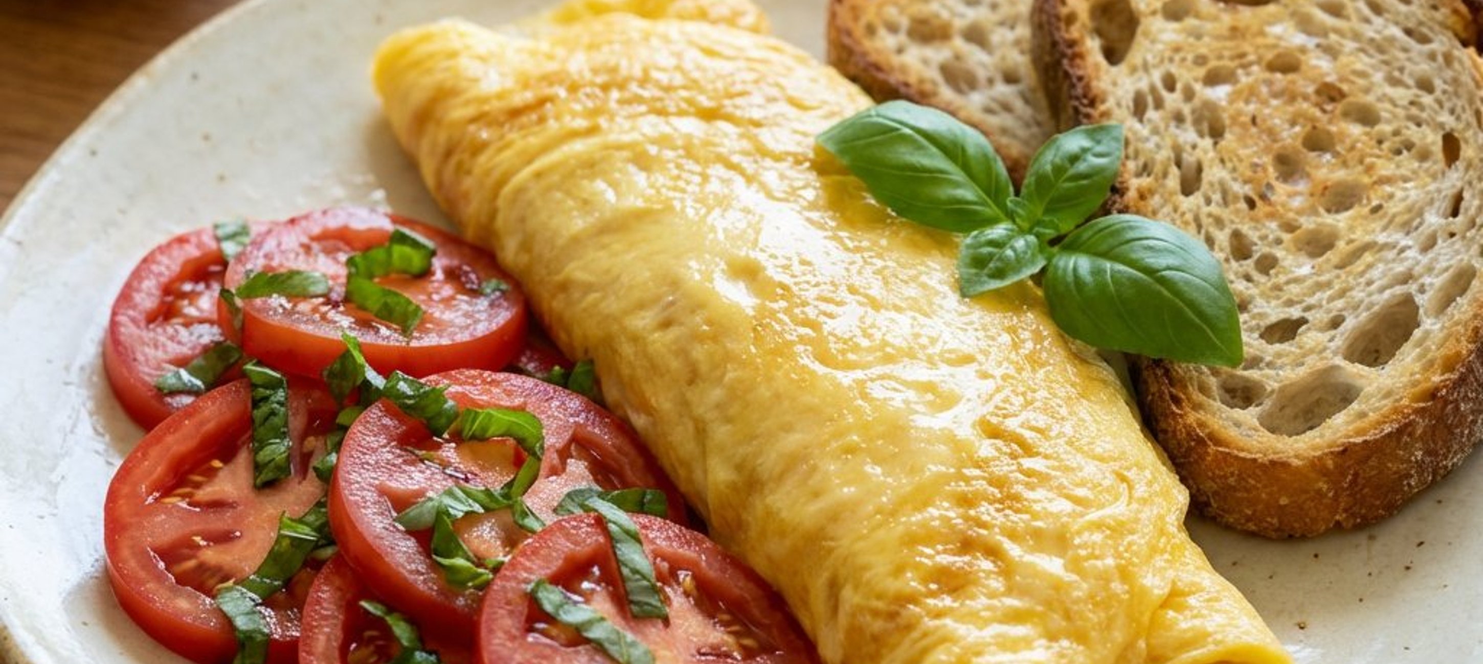 - 3Das Omelett zusammen mit den Sauerteigbrot-Scheiben und dem vorbereiteten Tomaten-Basilikum-Salat servieren.