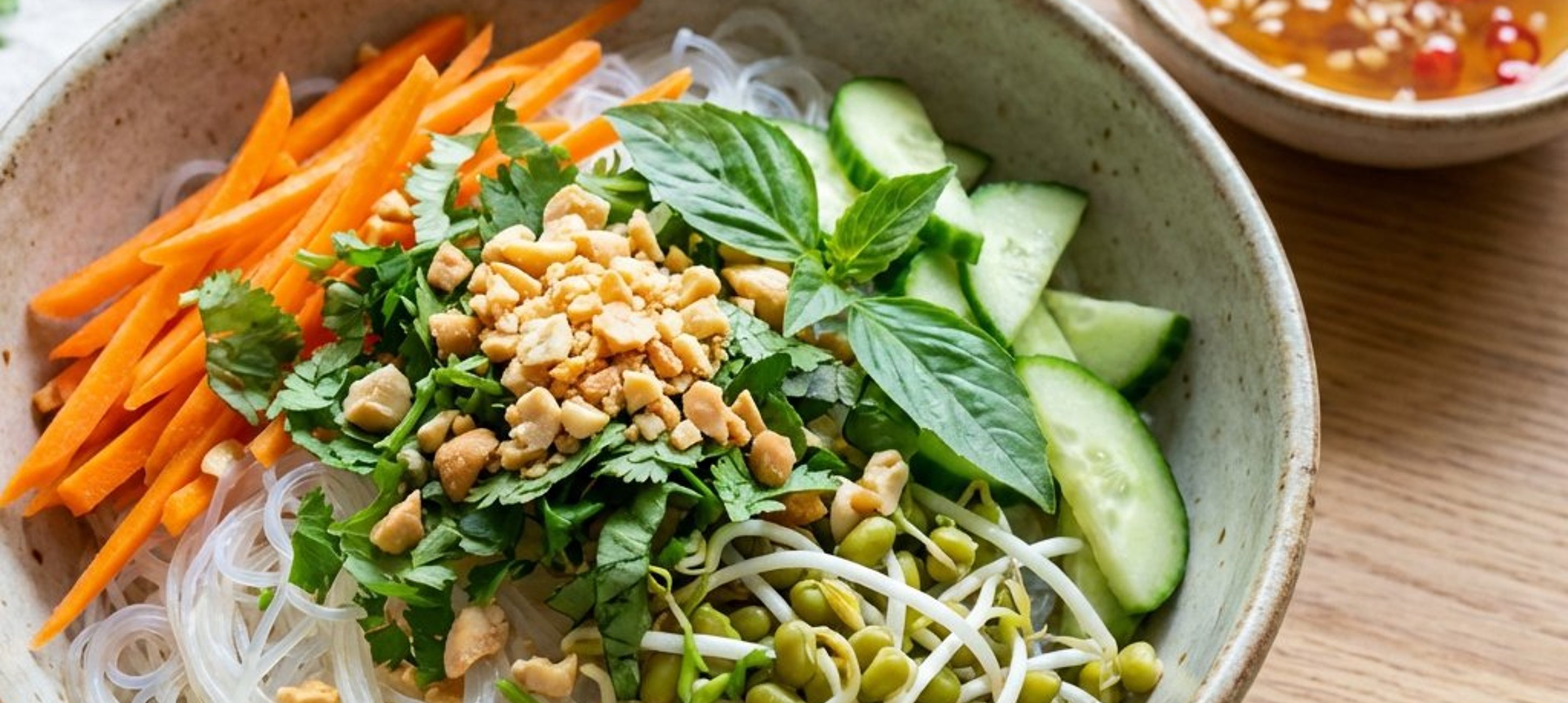- 2Die Karotten mit einem Sparschäler in feine Julienne-Streifen schneiden. Die Salatgurke halbieren und in feine Halbmonde schneiden. Koriander, Lauchzwiebeln und Thai-Basilikum grob hacken.
