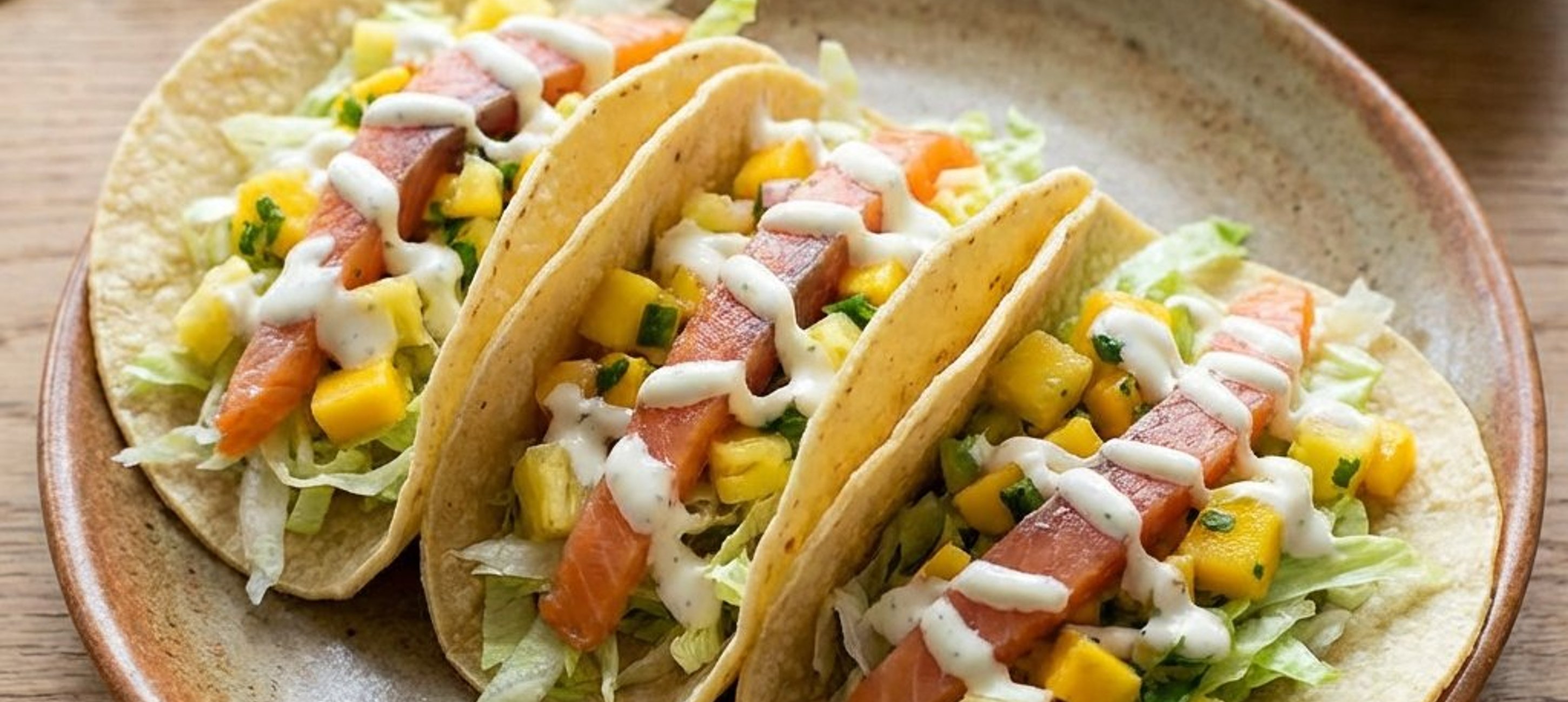 - 1Den Eisbergsalat in feine Streifen schneiden. Die Tortillas in einer Pfanne ohne Fett von beiden Seiten kurz erwärmen und sofort in eine U-Form biegen. Die Tortillas nebeneinander anrichten und nacheinander mit Eisbergsalat, der Mango-Ananas-Salsa und Streifen der geräucherten Lachsforelle füllen. Die fertigen Tacos mit dem Dressing beträufeln und sofort servieren.