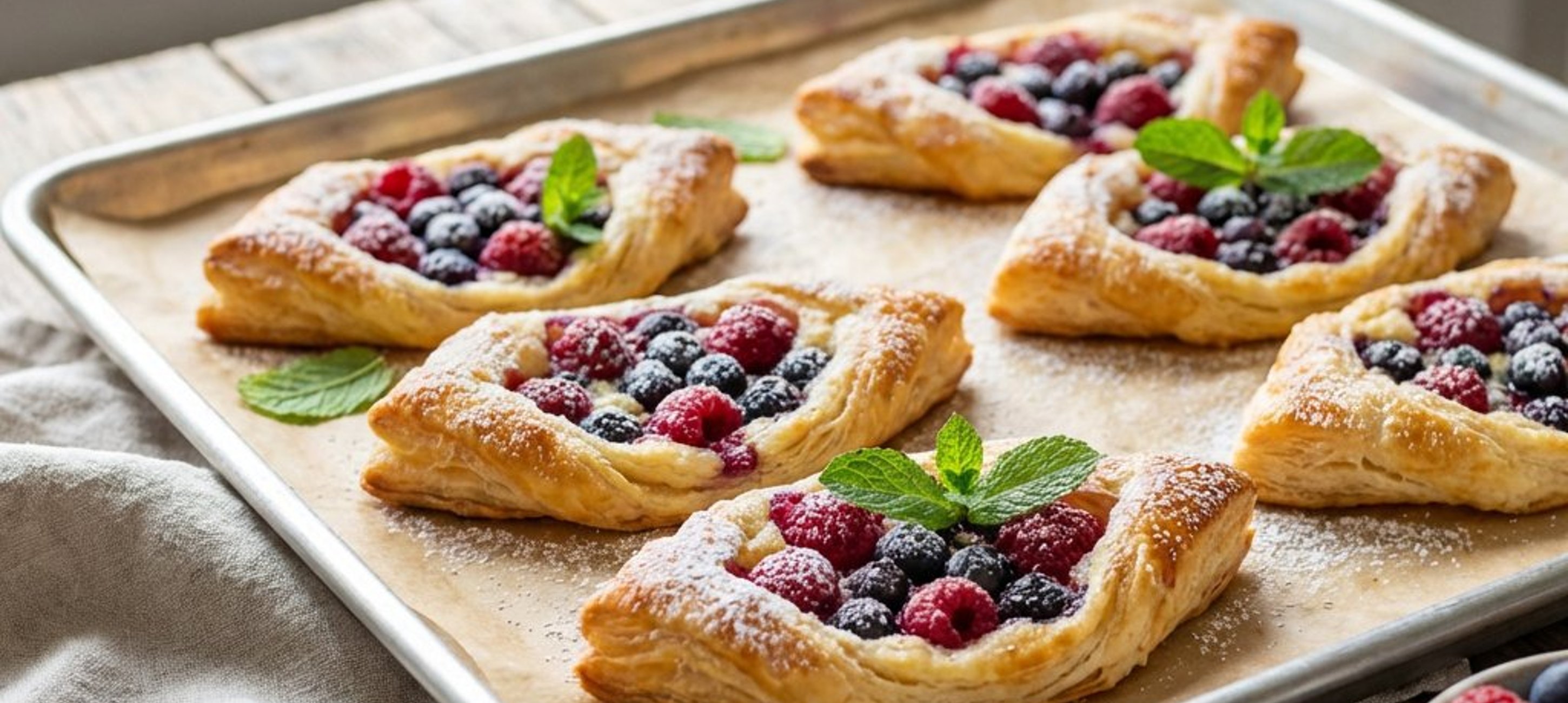 - 4Jedes Teigrechteck vorsichtig über die Beeren legen und die Ränder leicht andrücken, sodass die Beeren umschlossen sind.