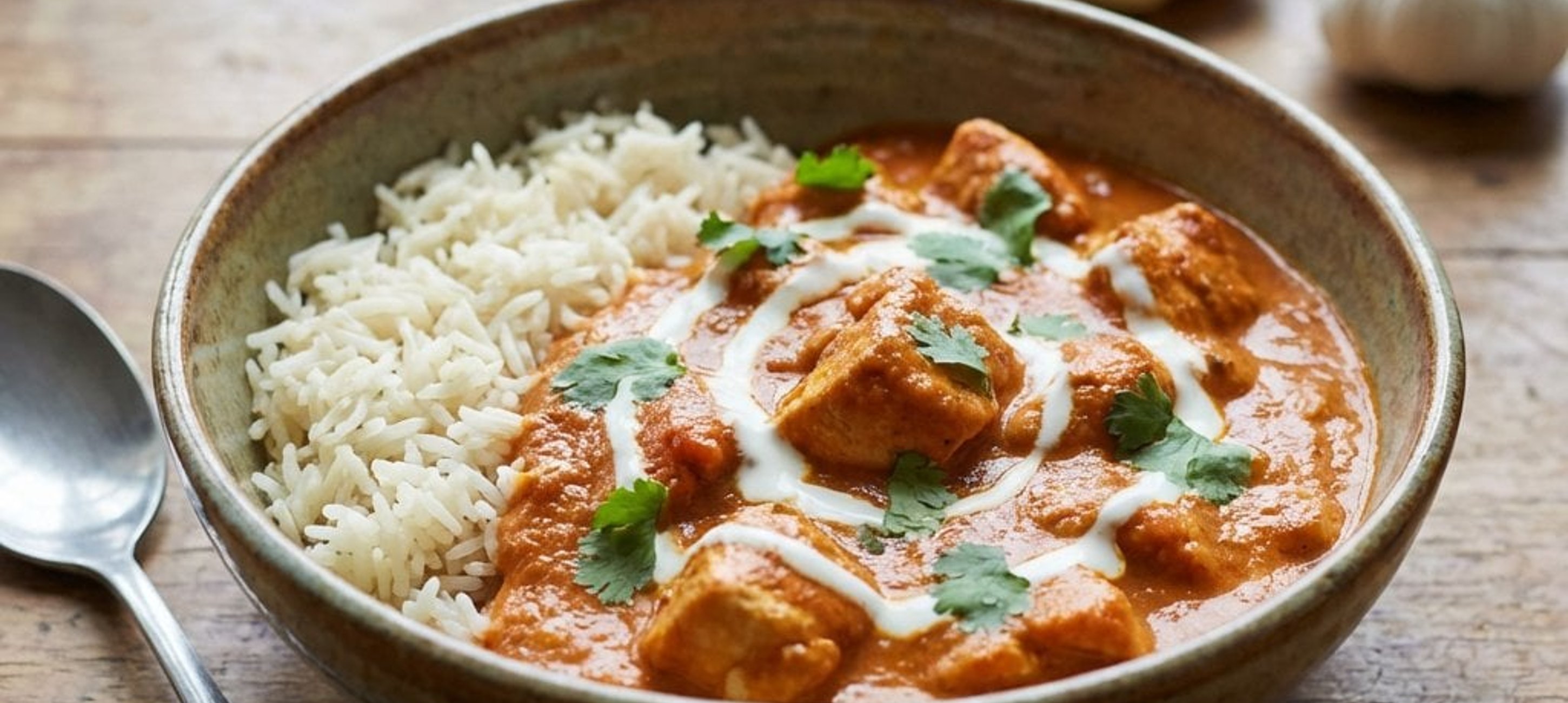 - 1Das fertige Chicken Tikka Masala auf Teller verteilen und zusammen mit dem Basmatireis servieren. Nach Belieben mit frischen Chiliringen garnieren.