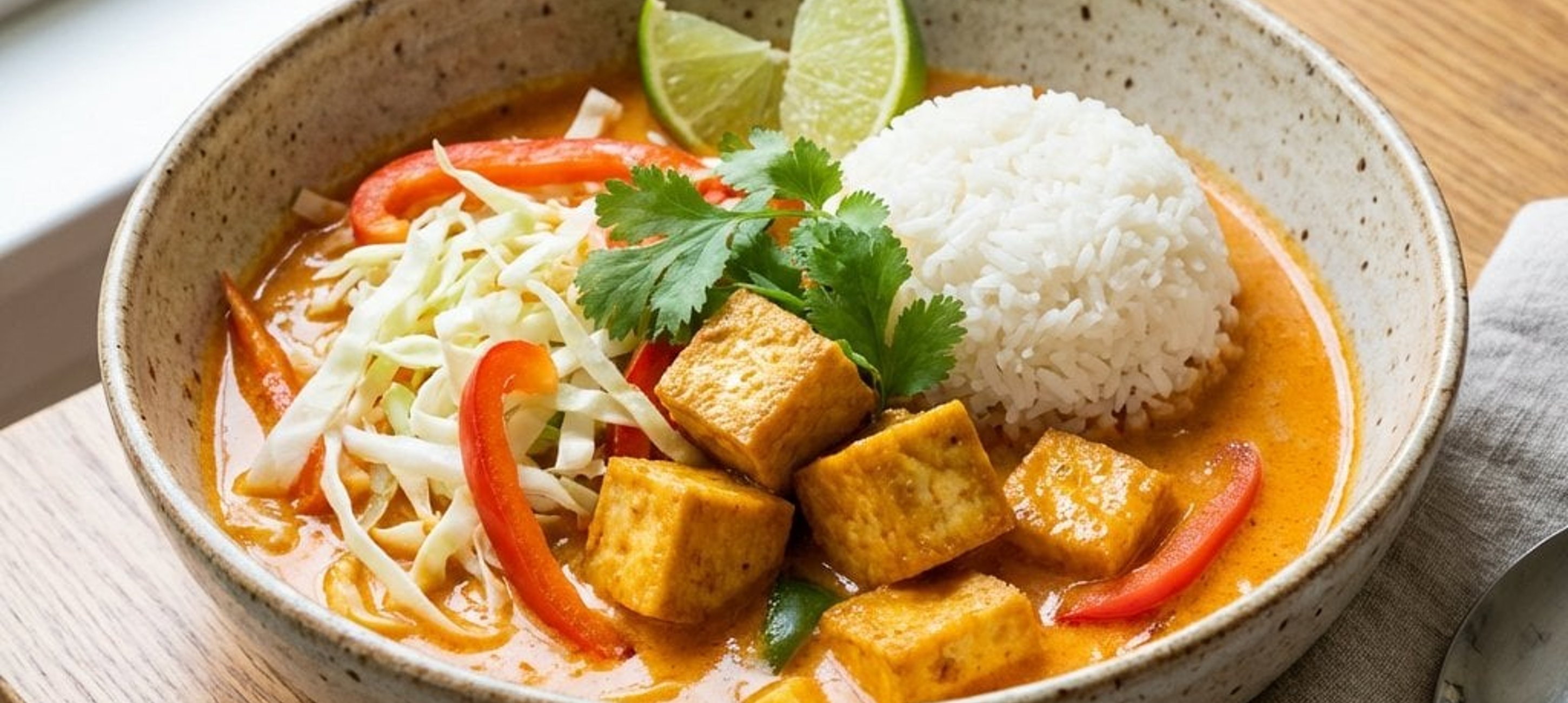 - 4Während der Reis gart, das Curry zubereiten: In einer Pfanne 3 EL Rapsöl bei mittlerer Hitze erhitzen. Tofuwürfel und Zwiebeln darin ca. 3–4 Minuten anbraten. Dann Weißkohl, Paprika, die vorbereitete Currypaste sowie Salz und Pfeffer hinzufügen und weitere 4–5 Minuten braten. Mit Kokosmilch und Gemüsebrühe aufgießen, Limettenabrieb und -saft hinzufügen, alles gut vermischen und aufkochen lassen. Die Hitze reduzieren und ca. 14–15 Minuten köcheln lassen, bis das Gemüse weich ist.