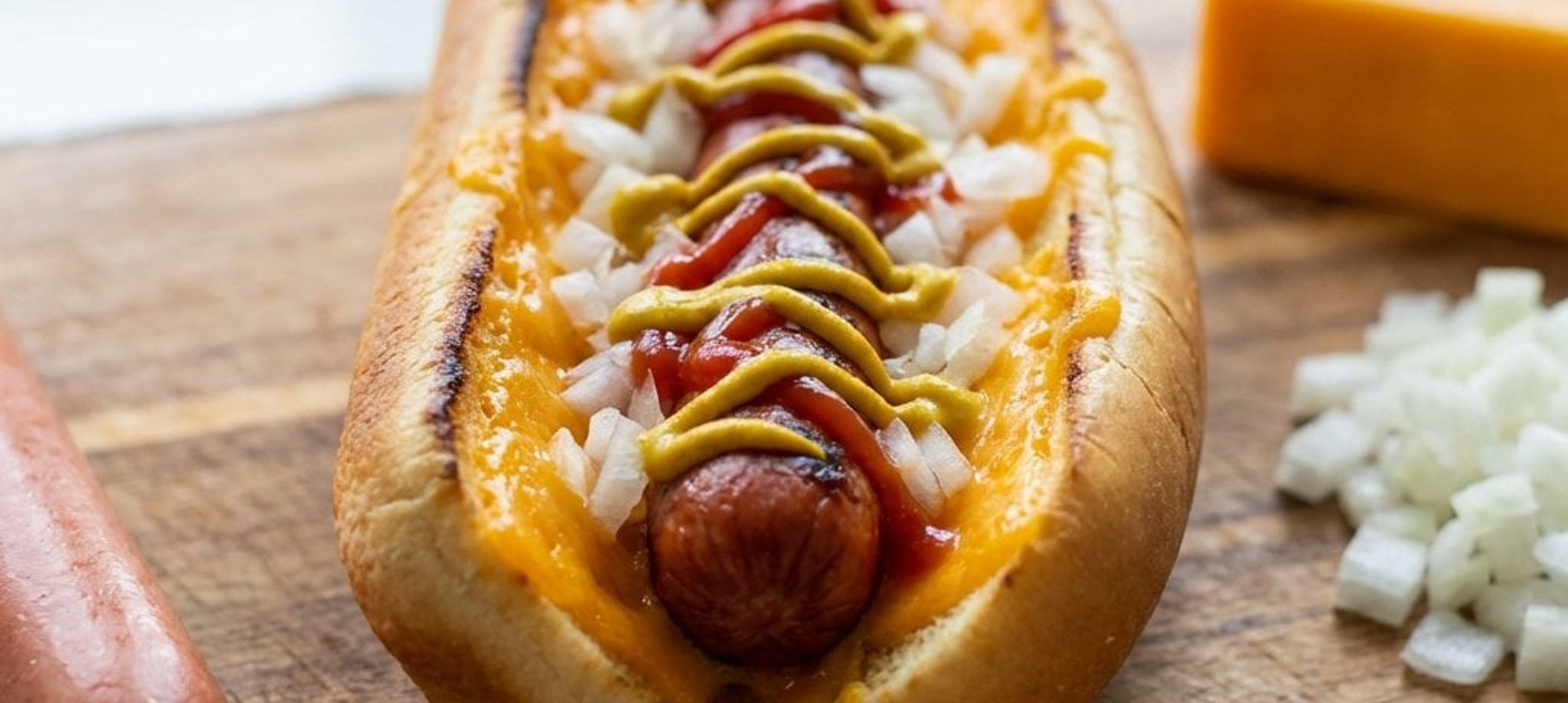 - 4Die fertigen Würstchen in die Brötchen legen. Großzügig mit dem geriebenen Cheddar und den Zwiebelwürfeln bestreuen. Ketchup und Senf nach Belieben hinzufügen.
